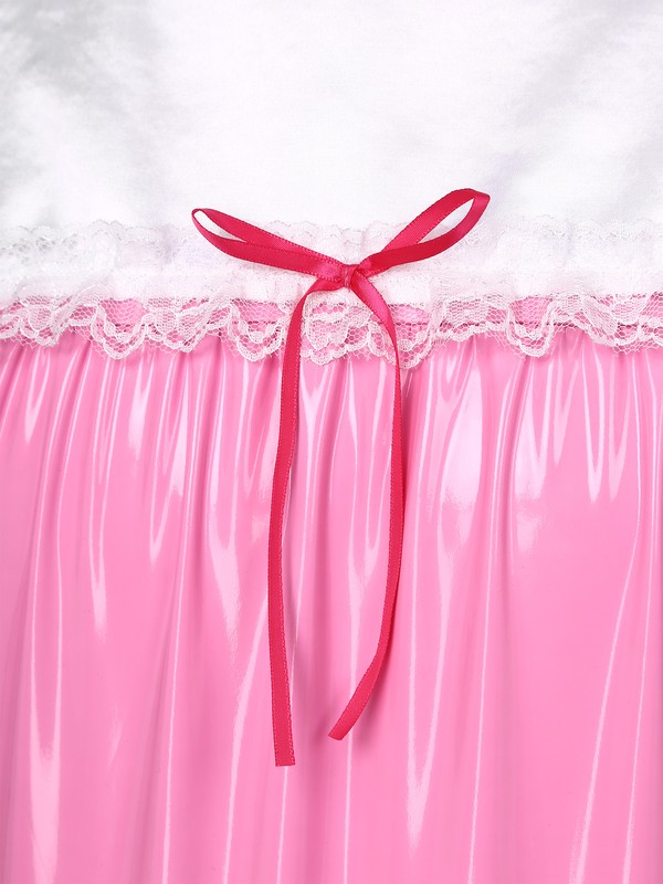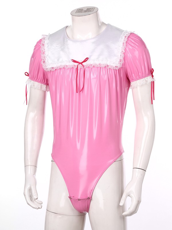 Patent leather bodysuit for men, puff sleeve, satin sailor collar, lace trim at cuffs and neckline, bowknots decoration.
