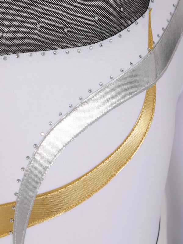 Design with long sleeve and round neckline, shiny bronzing cloth patchwork with polyester and mesh.