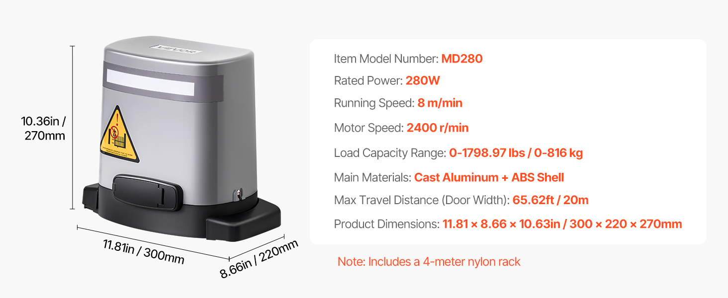 Questo apricancello è dotato di un potente motore da 280 W, in grado di gestire cancelli fino a 20 m di larghezza e 816 kg di peso, offrendo un funzionamento fluido e veloce (10 m/min) per risparmiare tempo.