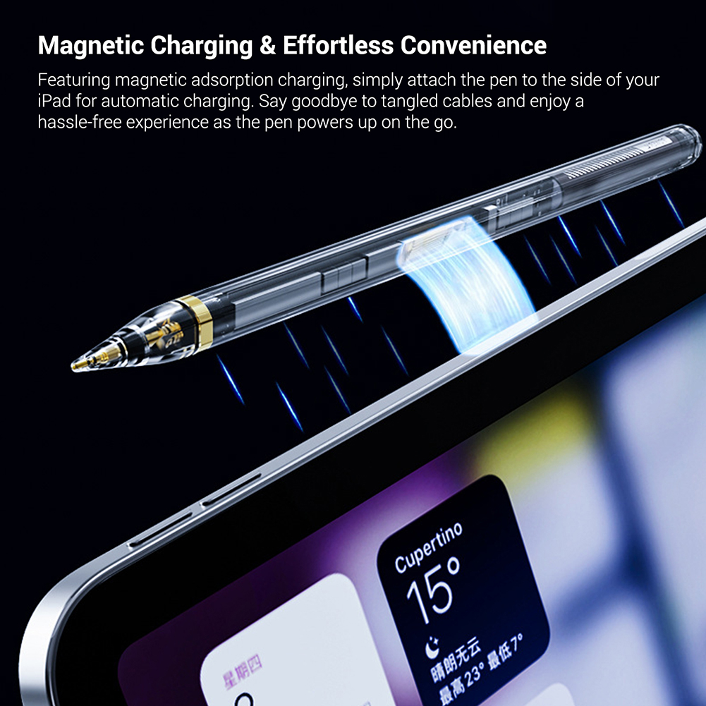 - Premium Transparent Capacitive Pen Design: Experience a refined, transparent design that feels just as good as it looks. The touch-sensitive pen is crafted with an exquisite, delicate touch that offers both comfort and precision for a smooth and enjoyable operation.- Magnetic Charging & Effortless Convenience: Featuring magnetic adsorption charging, simply attach the pen to the side of your iPad for automatic charging. Say goodbye to tangled cables and enjoy a hassle-free experience as the pen powers up on the go.