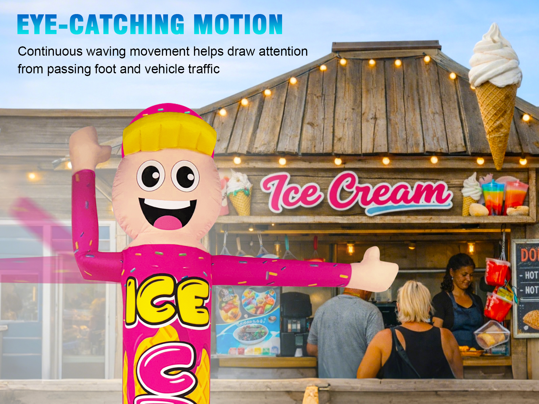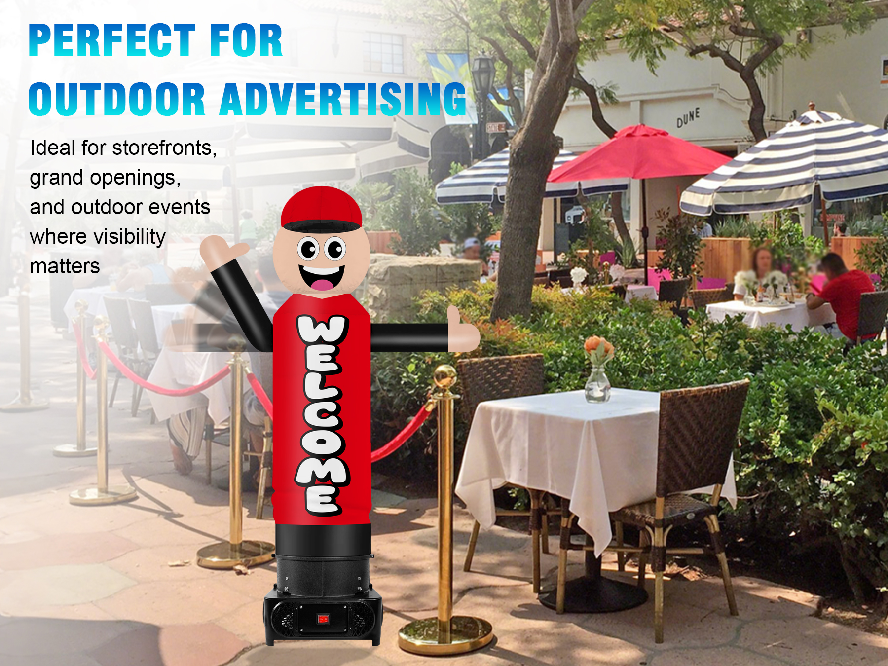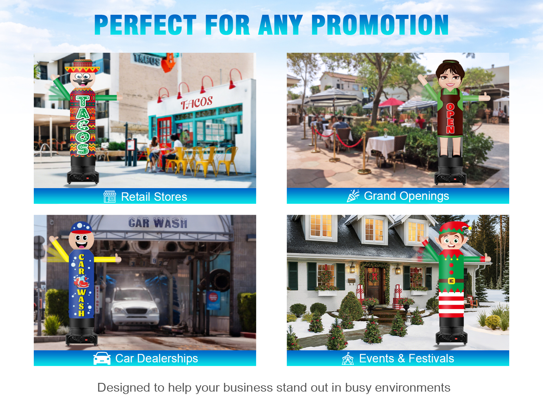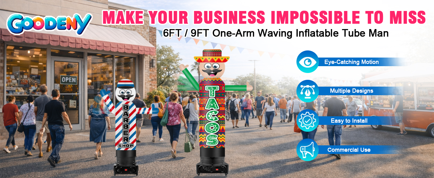 Attract Attention & Boost Brand Awareness:Eye-catching inflatable wavers perfect for drawing in foot traffic or catching drivers’ eyes, helping you stand out and increase brand visibility at events or storefronts.