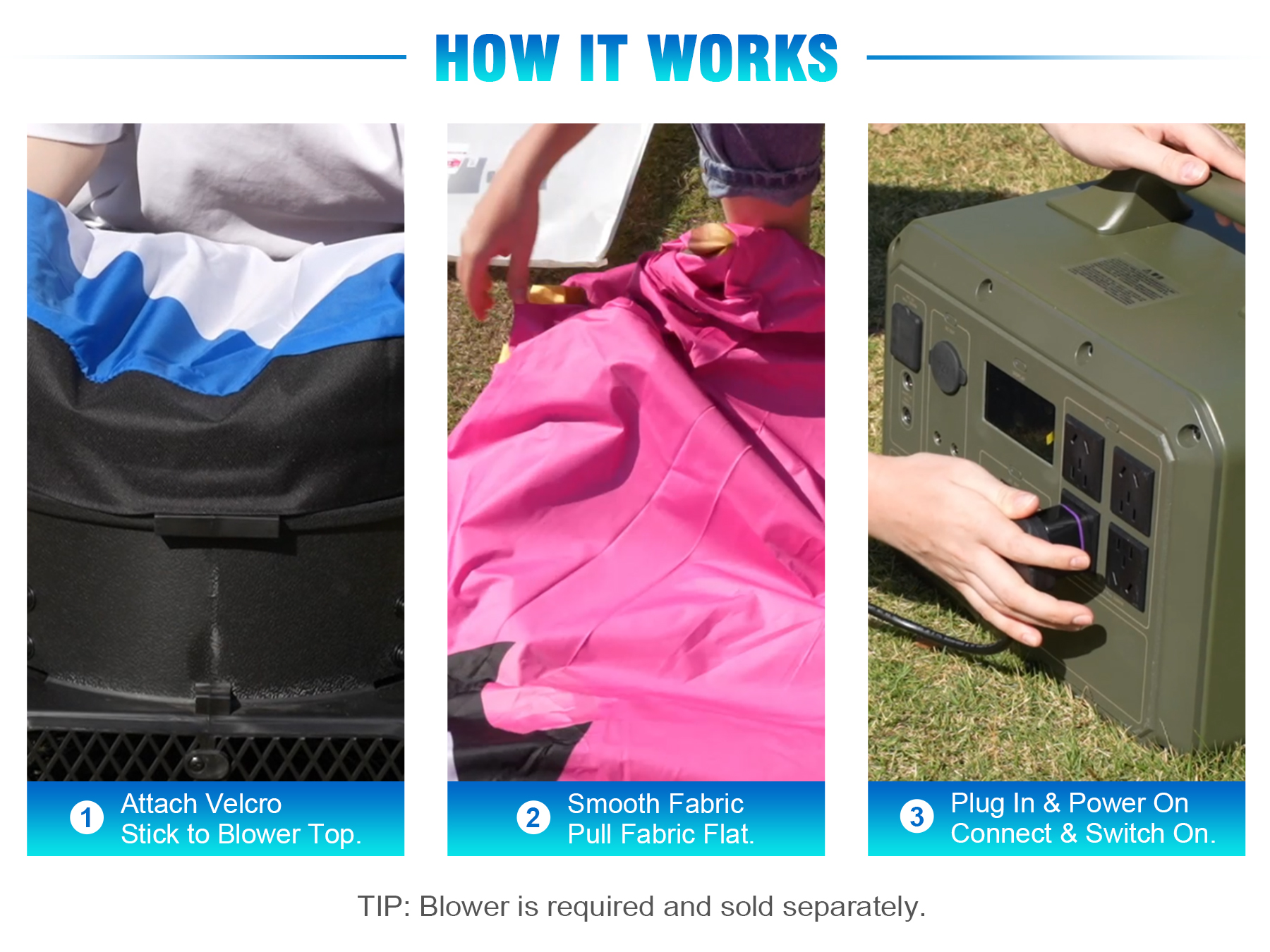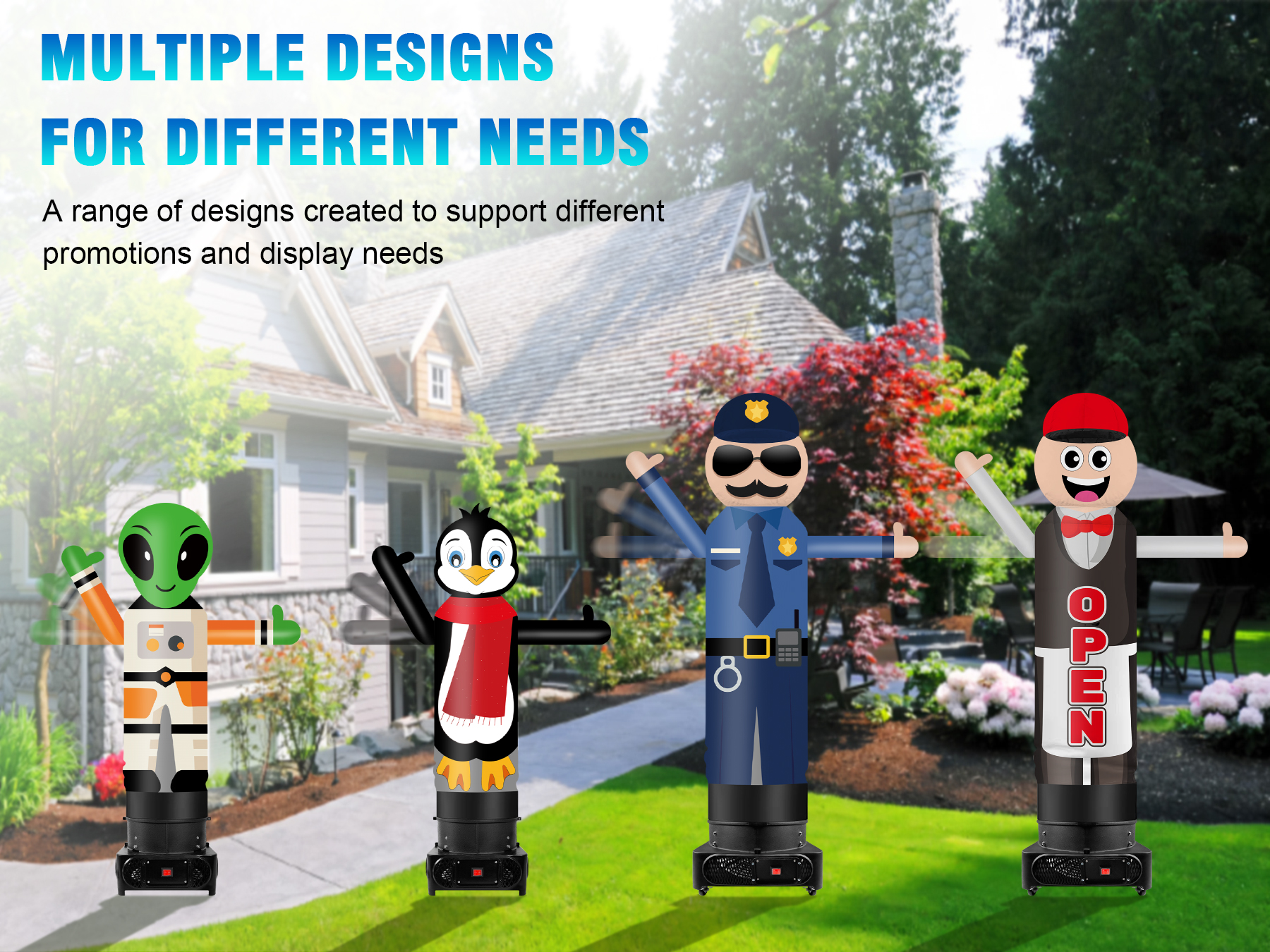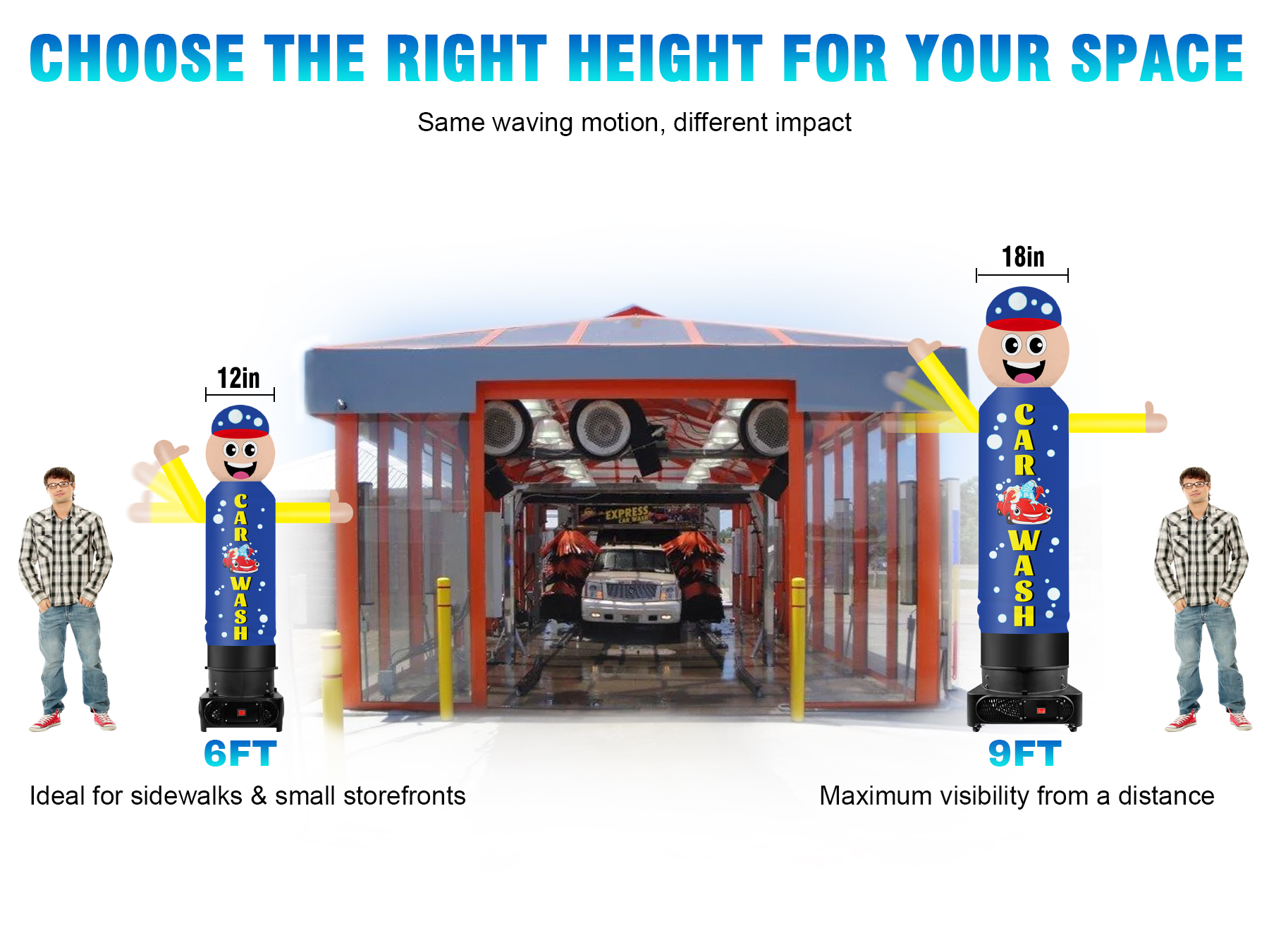 6FT version fits 12" blowers, ideal for smaller spaces with good visibility; 9FT version fits 18" blowers, taller and more eye-catching for outdoor promotions. Both require separate blower purchase.
