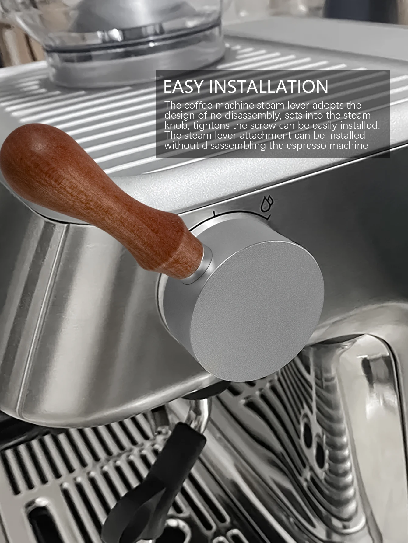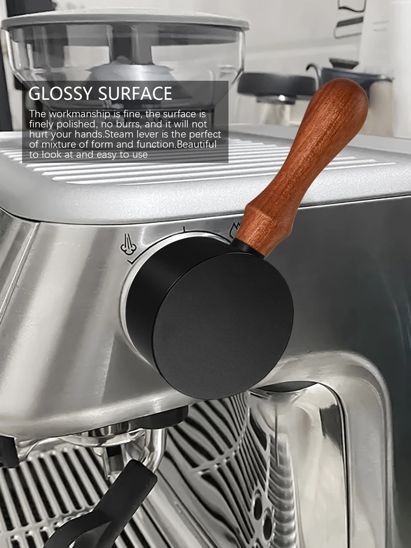 *Made of aluminum alloy head and wood handle, the steam lever gives improved control to the steam and water functions by replacing the default plastic twist knob.