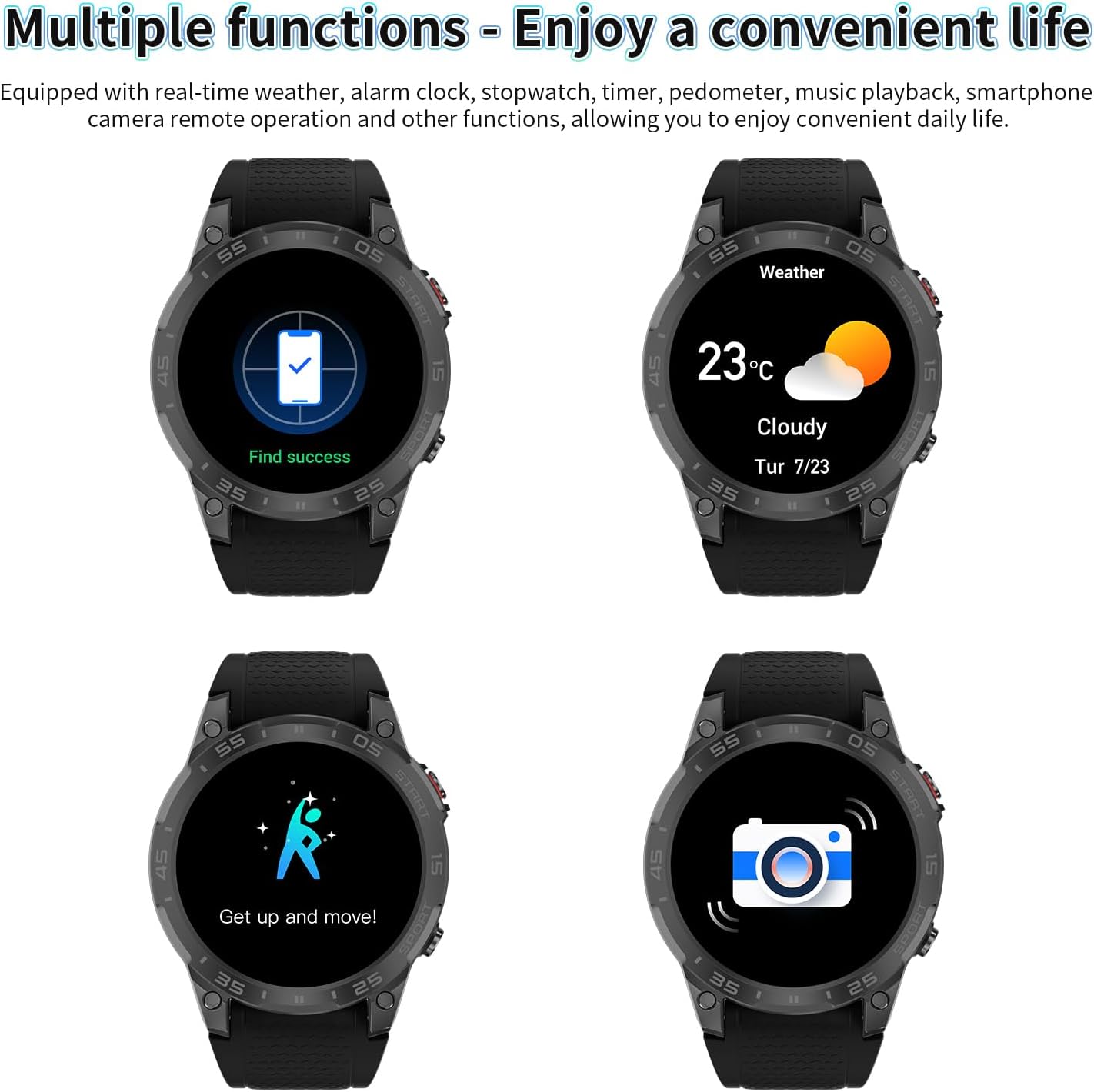⌚More Multi-function Activity Tracker --- Smart watch for men women has multiple functions such as timer, stopwatch, alarm clock, calendar, find your phone, sedentary reminder, drink water reminder, music control, weather forecast, don‘t disturb mode, brightness adjustment, camera control, female cycle tracking. It is the best gift for friends and family on Birthday, Anniversary, Valentine's Day, Christmas.