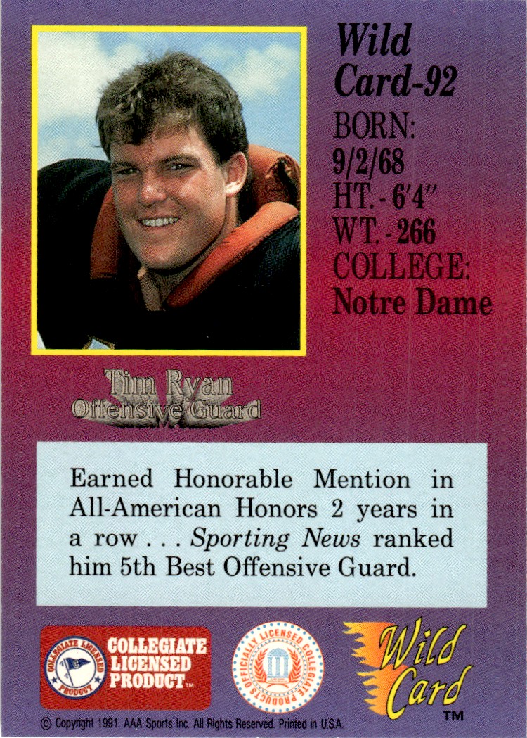 | 1991 Wild Card Draft Tim Ryan Notre Dame Fighting Irish #92 |