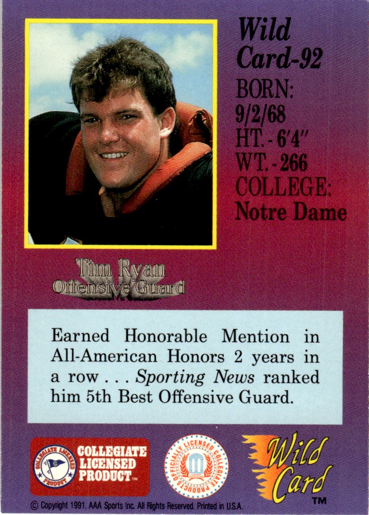 | 1991 Wild Card Draft Tim Ryan Notre Dame Fighting Irish #92 |