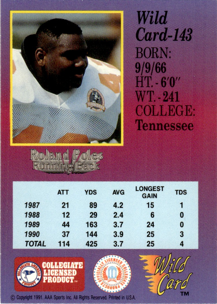 | 1991 Wild Card Draft Roland Poles Tennessee Volunteers #143 |