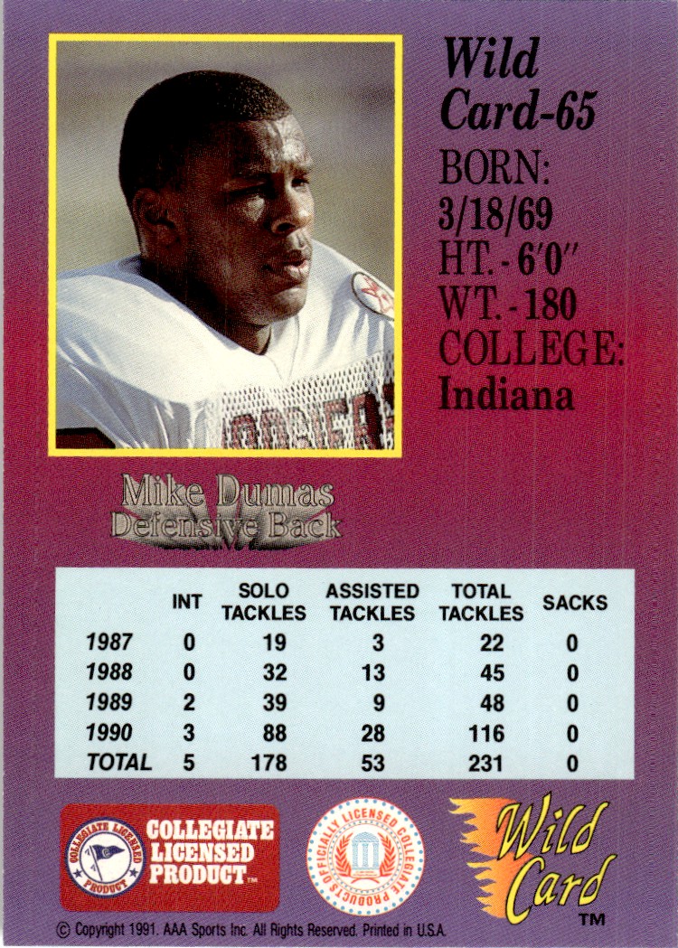 | 1991 Wild Card Draft Mike Dumas Indiana Hoosiers #+6 |