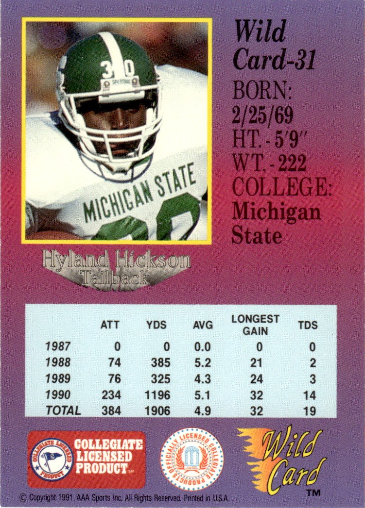 | 1991 Wild Card Draft Hyland Hickson Michigan State Spartans #31 |