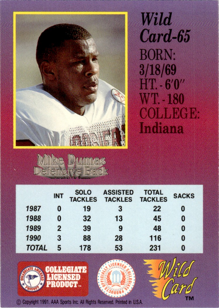 | 1991 Wild Card Draft Mike Dumas Indiana Hoosiers #65 |