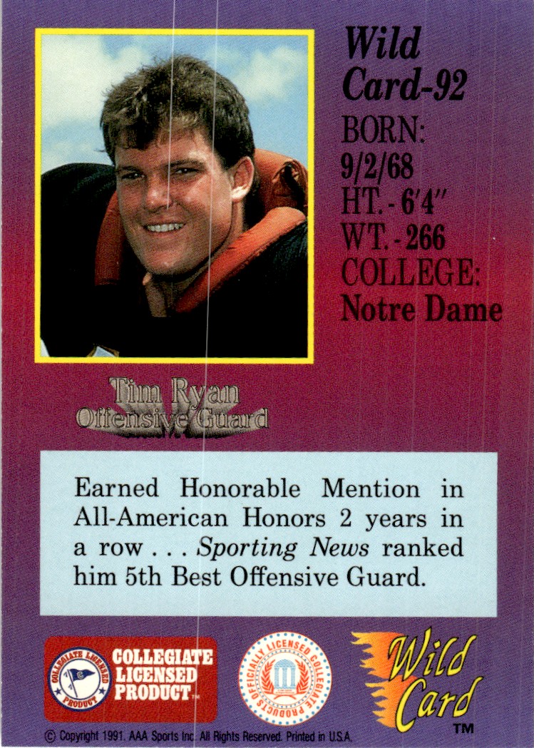 | 1991 Wild Card Draft Tim Ryan Notre Dame Fighting Irish #92 |