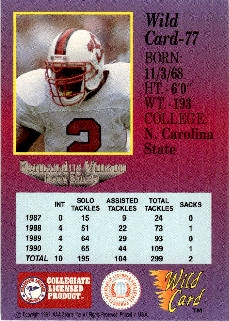 | 1991 Wild Card Draft Fernandus Vinson NC State Wolfpack #77 |