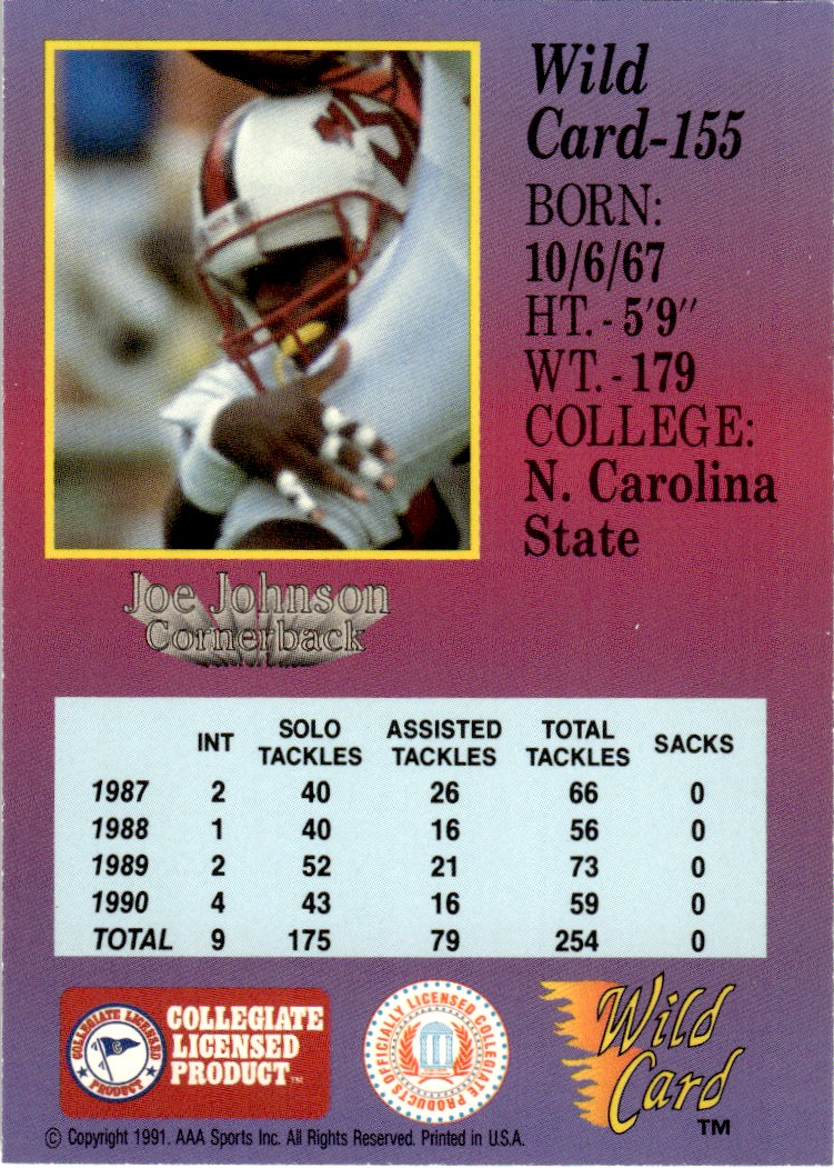 | Description: | Joe Johnson | | Category: | Football | | Year: | 1991 | | Product: | Wild Card Draft | | Team: | NC State Wolfpack | | Card Number: | 155 | | Dimensions: | 3½" x 2½" | | SKU: | FT B0002 R03 A (1) |