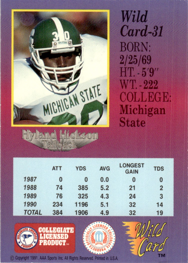 | 1991 Wild Card Draft Hyland Hickson Michigan State Spartans #31 |