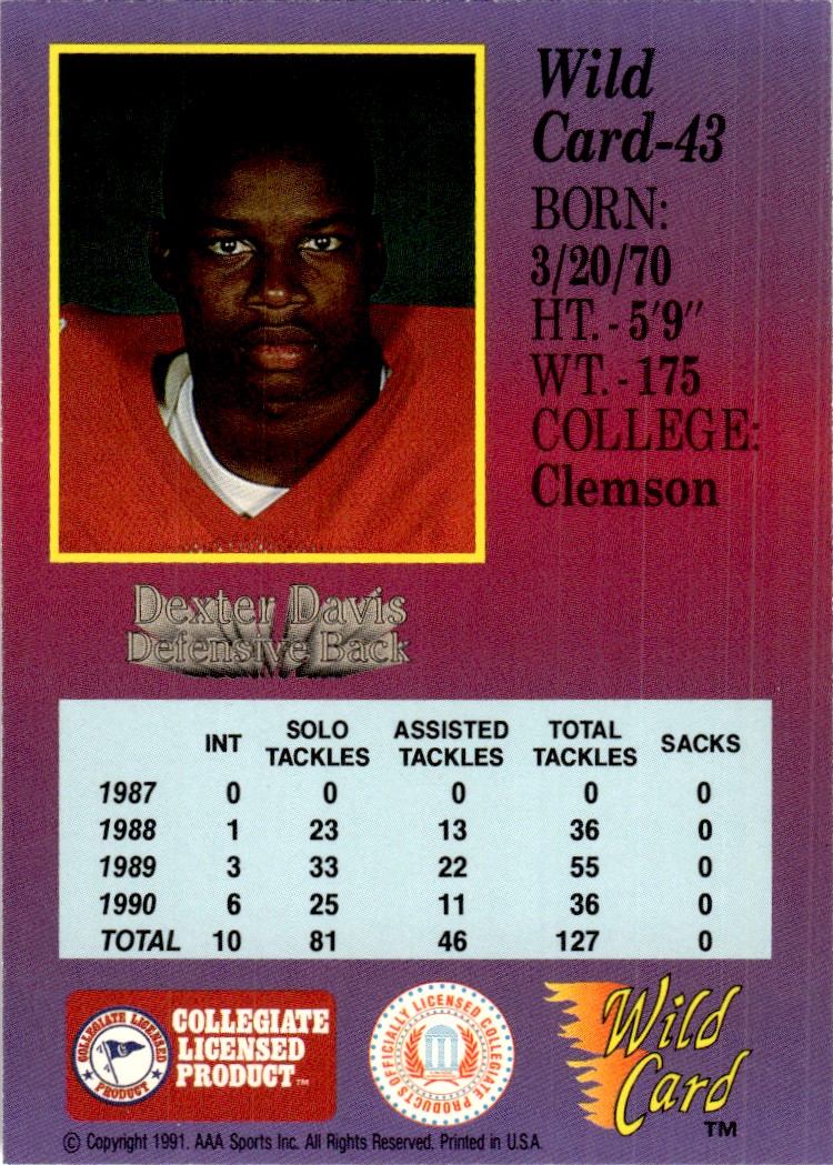 | 1991 Wild Card Draft Dexter Davis Clemson Tigers #43 |