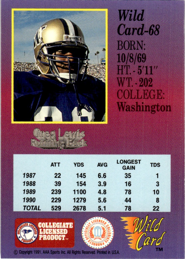 | 1991 Wild Card Draft Greg Lewis Washington Huskies #68 |