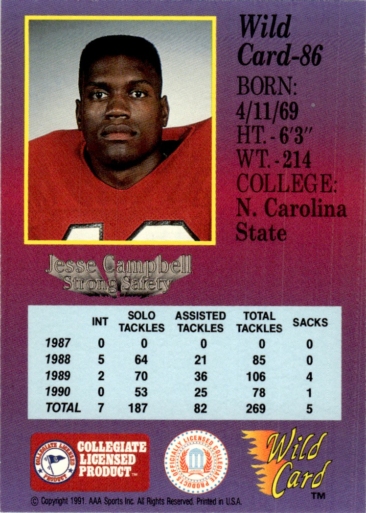 | 1991 Wild Card Draft Jesse Campbell NC State Wolfpack #86 |