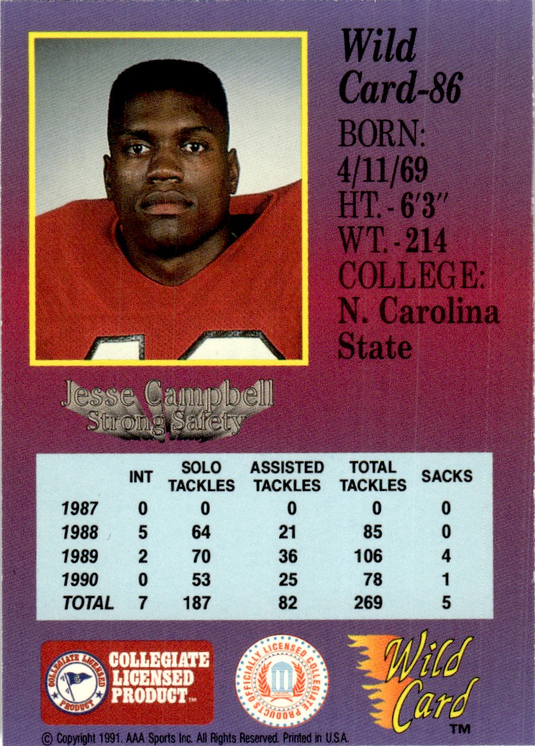 | 1991 Wild Card Draft Jesse Campbell NC State Wolfpack #86 |