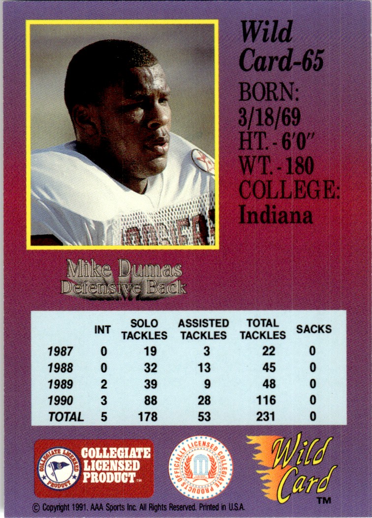 | 1991 Wild Card Draft Mike Dumas Indiana Hoosiers #65 |