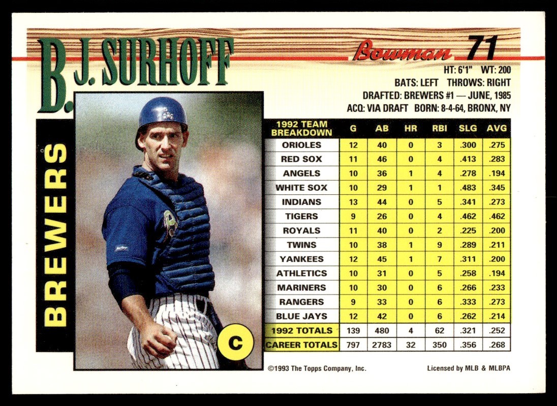 | 1993 Bowman B.J. Surhoff Milwaukee Brewers #71 |