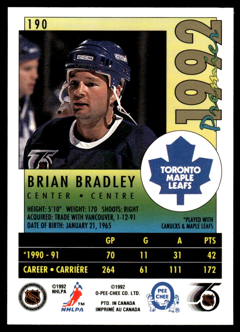 | 1991-92 O-Pee-Chee Premier Brian Bradley Toronto Maple Leafs #190 |