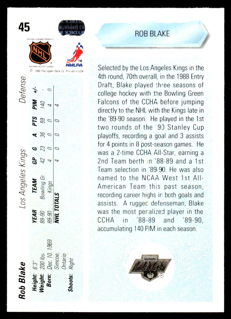 | 1990-91 Upper Deck Rob Blake Rookie Los Angeles Kings #45 |