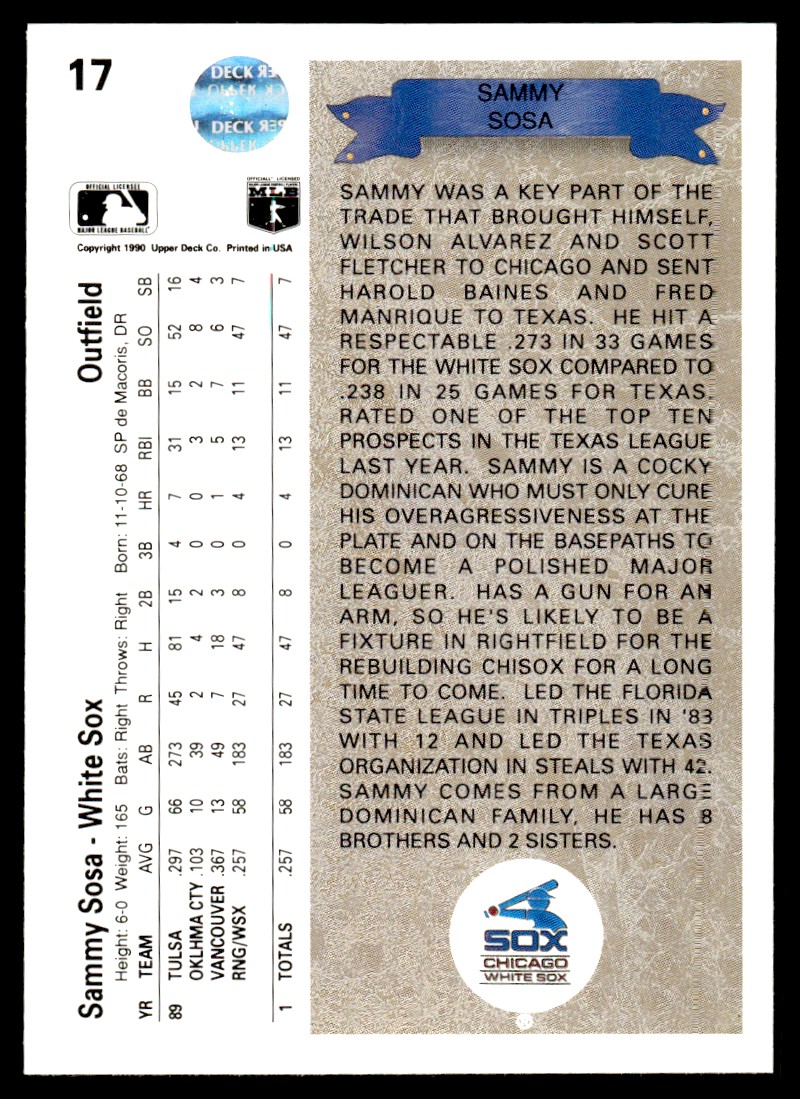 | 1990 Upper Deck Sammy Sosa Rookie Chicago White Sox #17 |