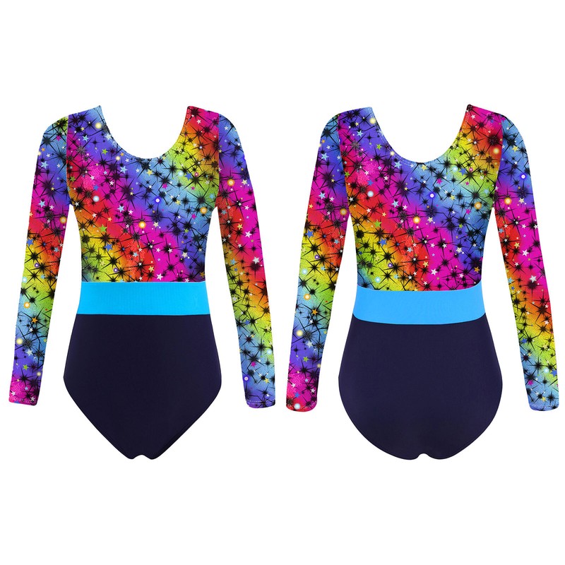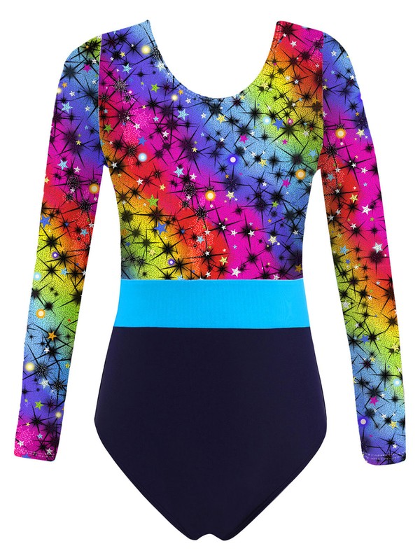 Long sleeves, stars print, color block patchwork, one-piece ballet dance leotard.