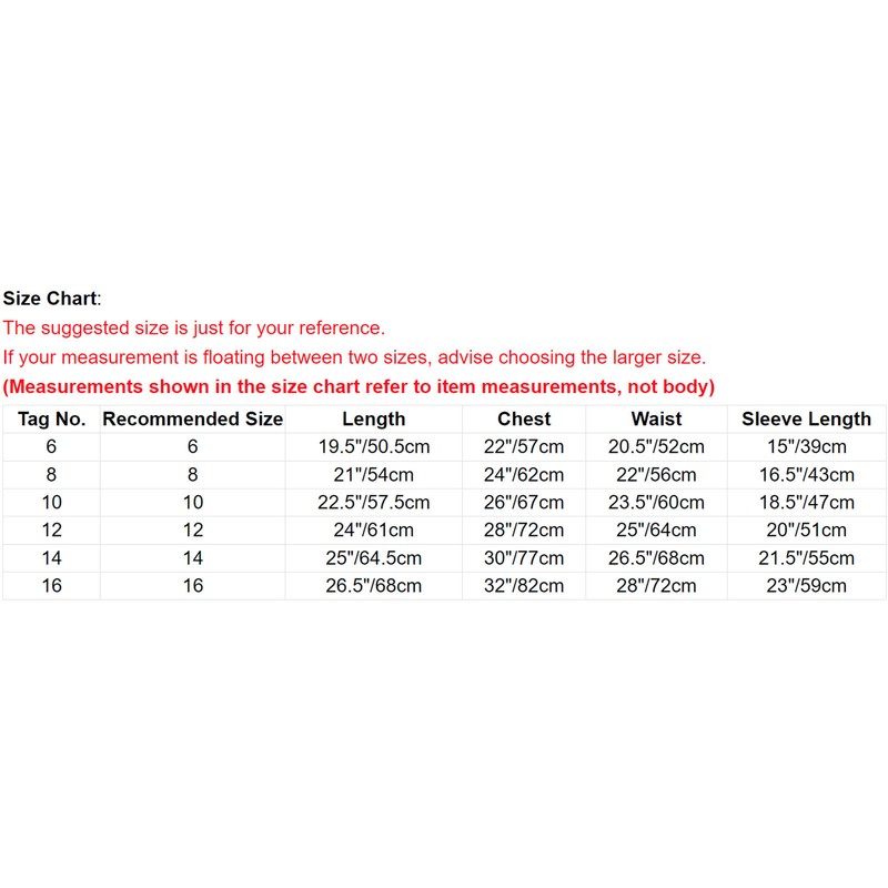 | Tag No. | Recommended Size | Length | Chest | Waist | Sleeve Length |