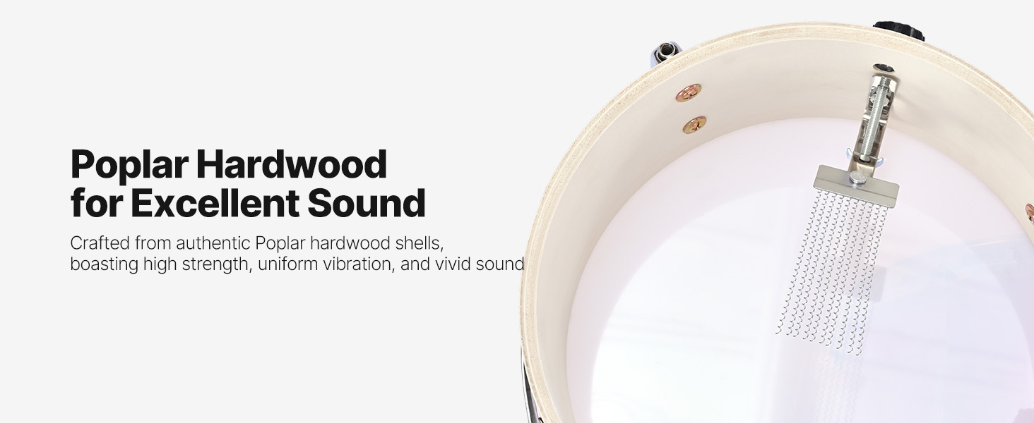 R: I fusti dei tamburi sono realizzati in legno di pioppo tramite processi di elettroforesi, verniciatura e galvanica, che garantiscono sia robustezza che una finitura elegante.