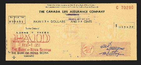 Canada Excise Tax Meter 149007 6c red. Canada Life Assurance Company bank check