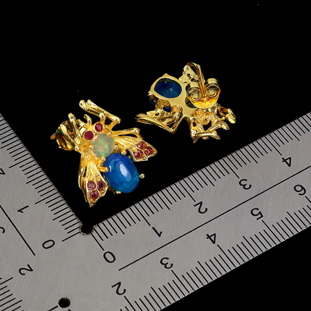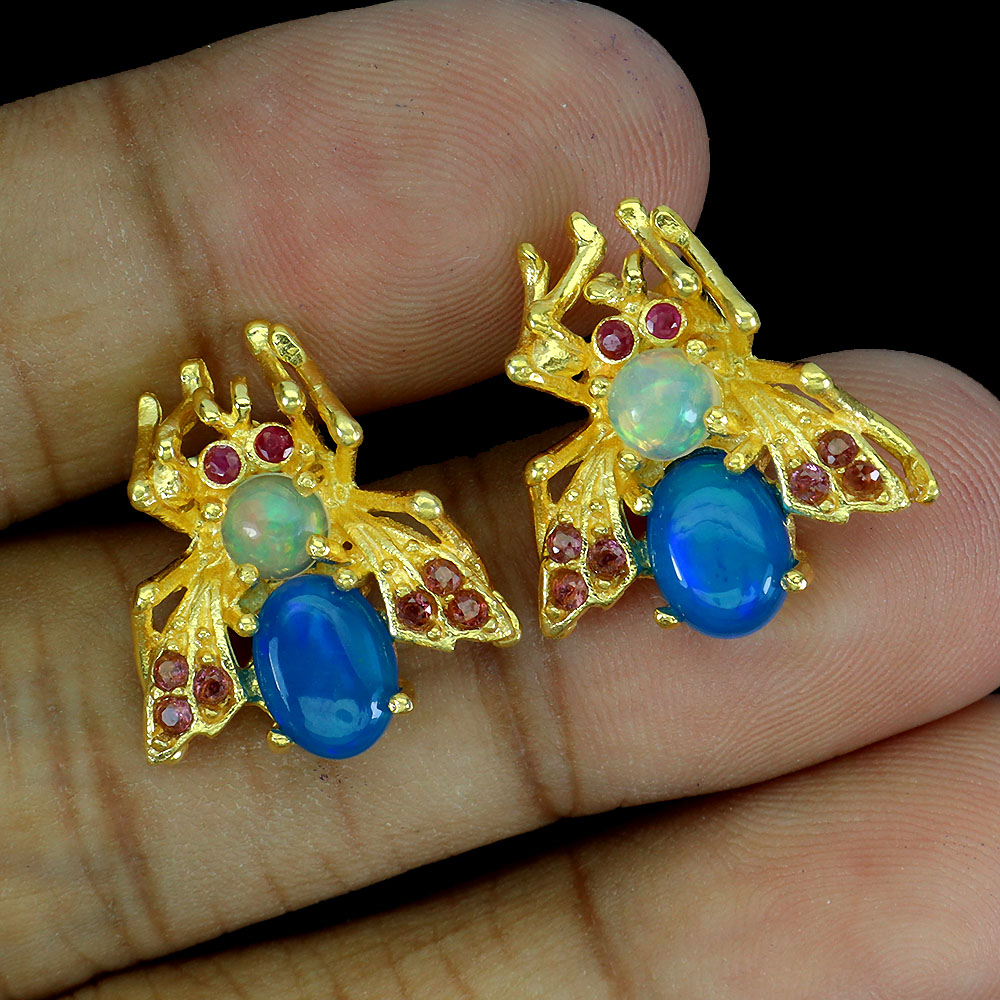 925 Sterling Silver Earrings Oval Blue Opal 8x6mm Fire Opal Gemstone Bee Jewelry
