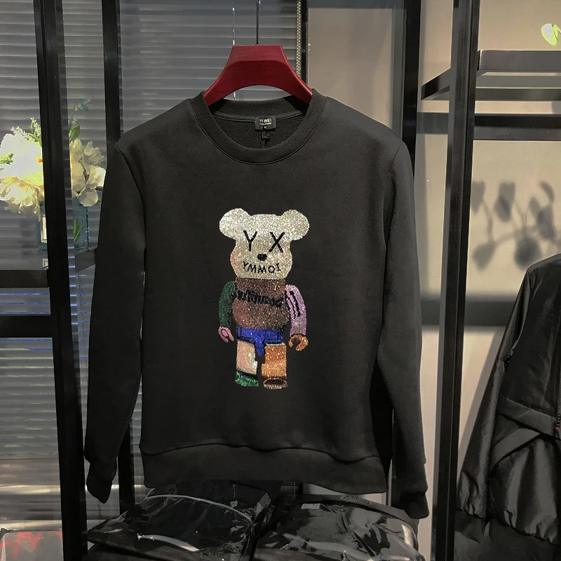New Men Luxury Diamond Bear Rhinestones Fashion Black Hoodie High Quality
