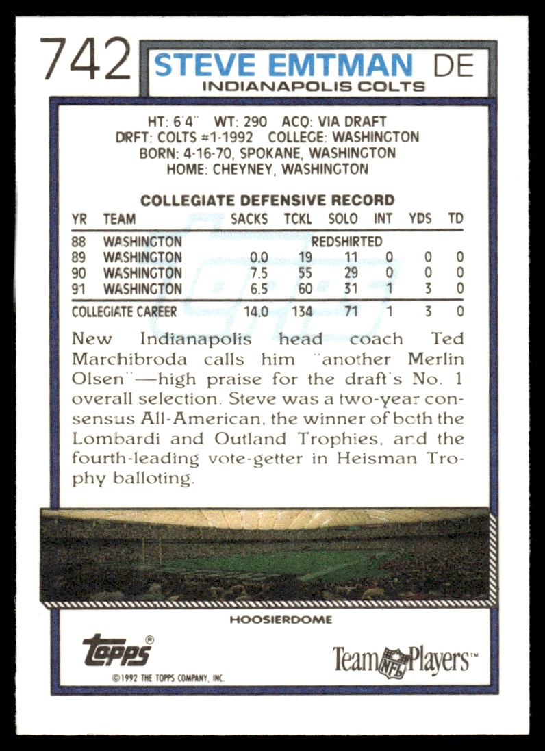 | 1992 Topps Steve Emtman Rookie Indianapolis Colts #742 |