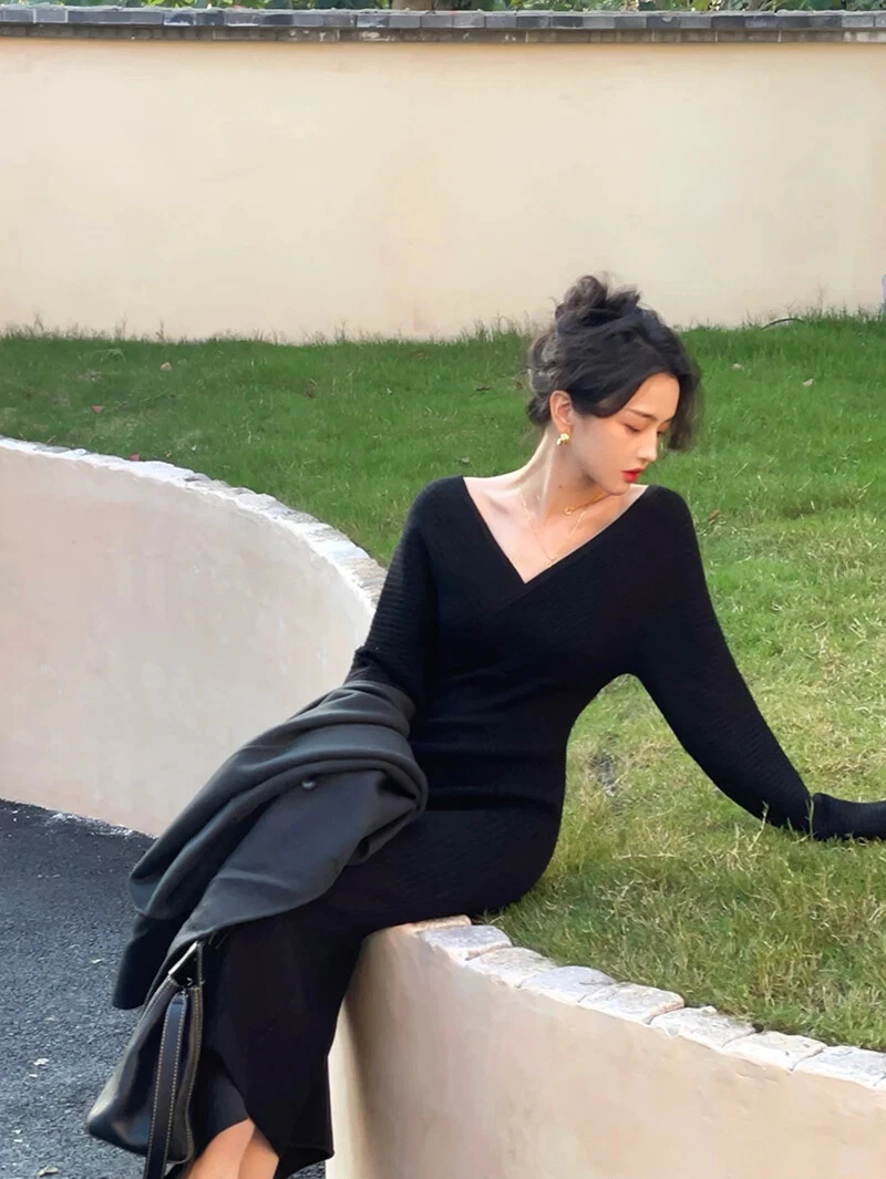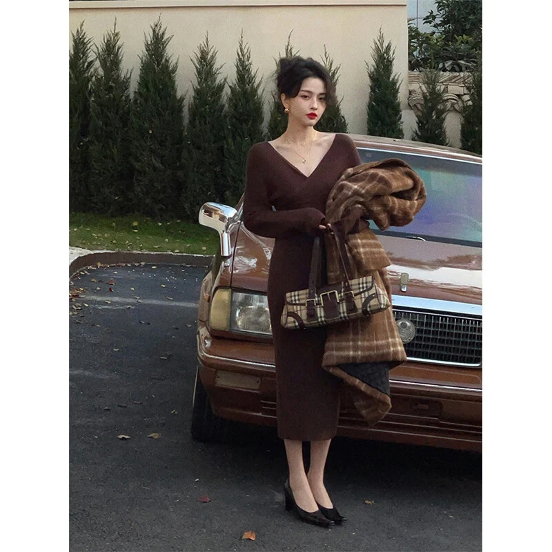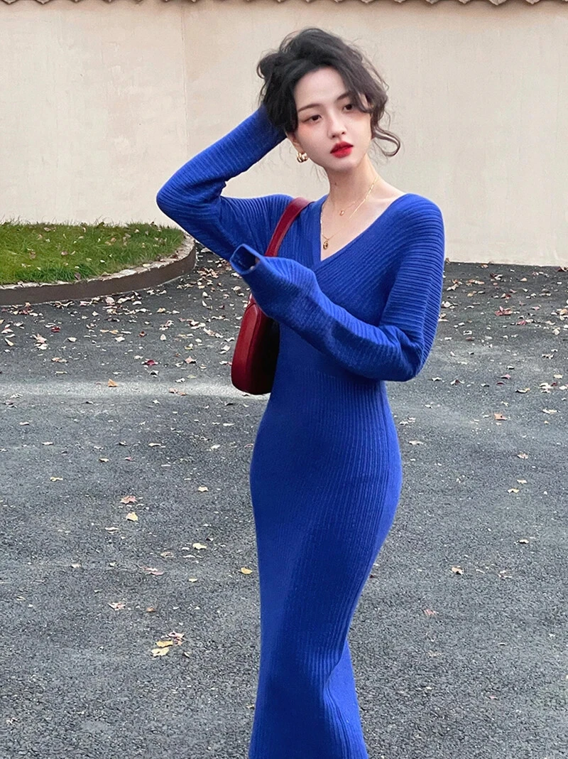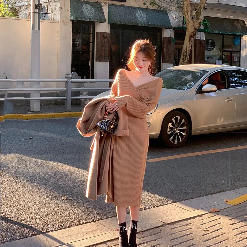 Knitted Midi Dress Women V Neck Sweater Dresses Winter Ladies