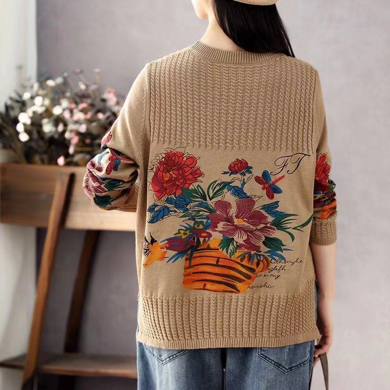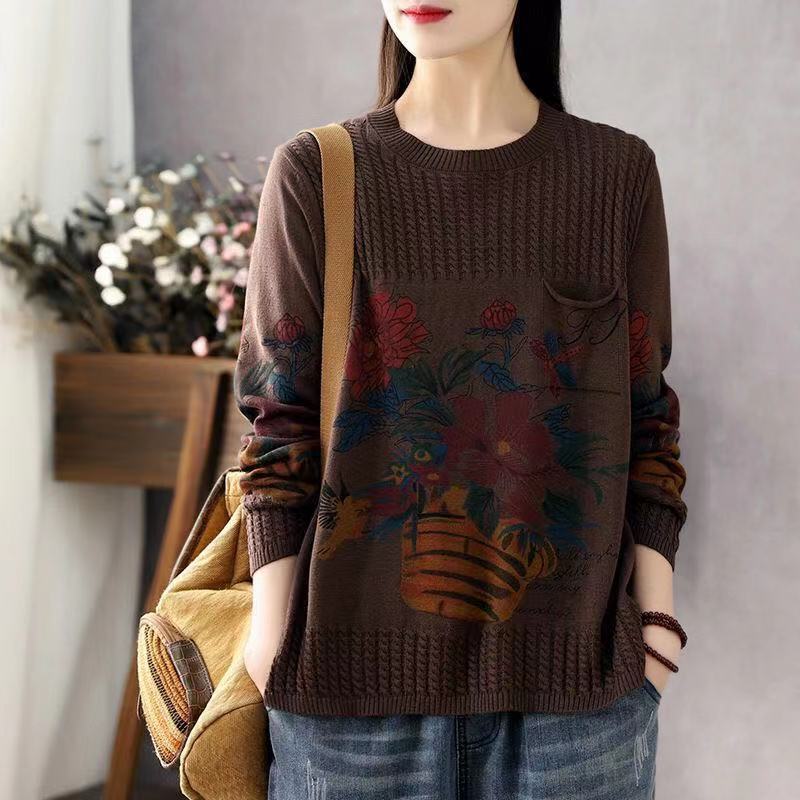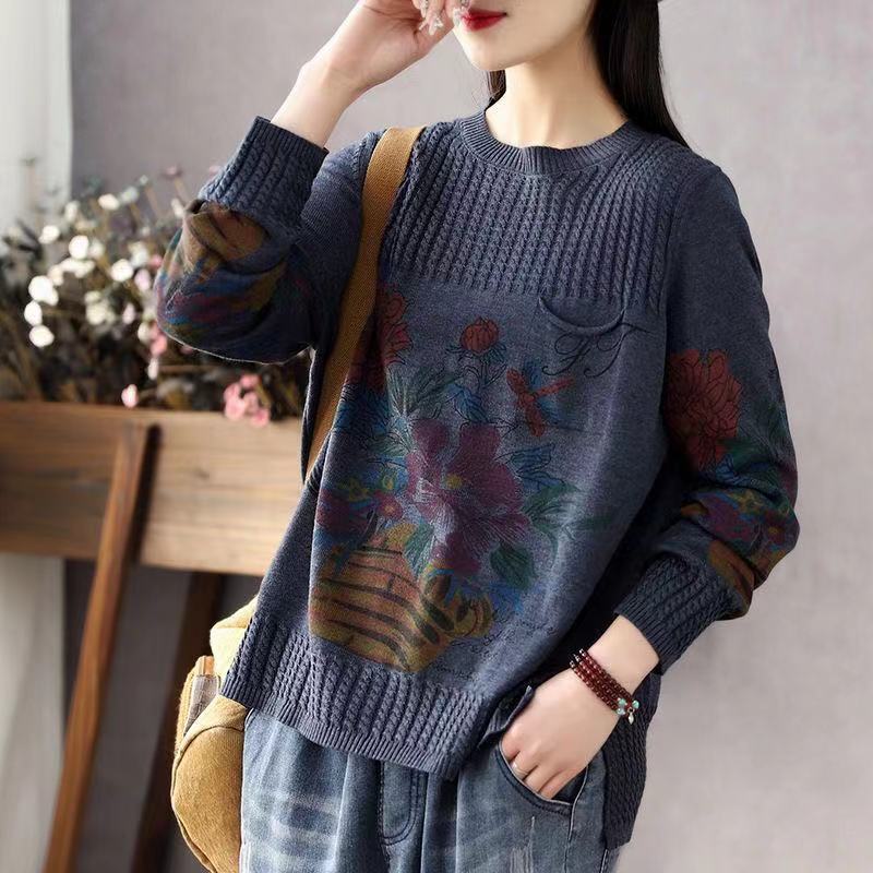Women Retro Round Neck Folk Sweater Loose Fit Pullover Printed Casual Knitwear