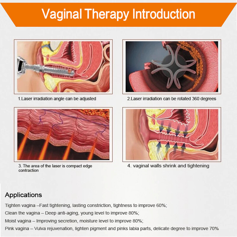 Private laser for vaginal relaxation is a 10600nm water absorption gold standard laser, using the perfect combination of three-dimensional lattice technology and 360-degree circular emission technology, producing a high temperature of 50-70 degrees Celsius in the controllable depth of the vaginal mucosa, stimulating the lamina propria And the fibroblasts in the muscular layer are regenerated, and the damaged collagen fibers, elastic fibers, etc. are reorganized, thereby achieving thickening and tightening of the vaginal wall, so that the firmness of the vagina is enhanced, the sensitivity is enhanced, and the vagina is as tight as ever. The private laser does not cause epidermal burns due to excessive temperature and can act on Mucosa tissue with a thickness of several hundred nanometers each time with homogeneous heat.