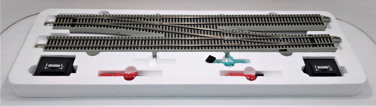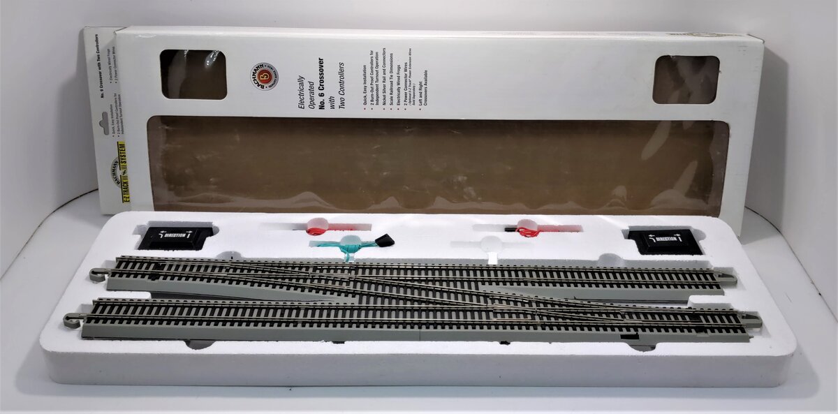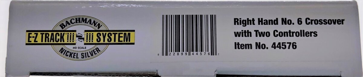 This is a Bachmann 44576 HO #6 E-Z Track Right-Hand Remote Crossover Switch Turnout.