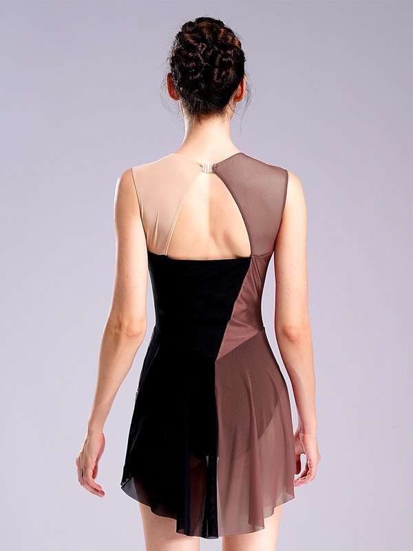 Crafted from a blend of polyester, nylon, and rhinestones, this dress offers durability, flexibility, and a touch of sparkle, ensuring a comfortable and eye-catching performance.