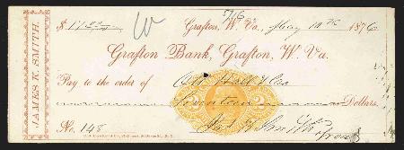 Scott RN-F1. Grafton, West Virginia. Grafton Bank, James K. Smith bank check. 1876. Brown on white. Printed by C.G. Crawford & Co., Stationers, New York. Used, VF