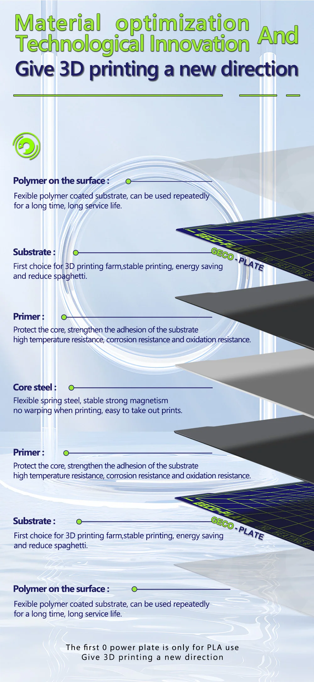 In 2025, JUUPINE launched a new cold plate exclusively for PLA and named it GECO. As the name suggests, it allows the printed parts to stick to the plate like a gecko. GECO is specially made with a frosted texture on the surface. When the filament contacts it, it makes full use of the subtle force between molecules - Van der Waals force, to build countless stable microscopic connections, so that the printed parts are firmly formed and tightly "adsorbed" on it like a gecko.