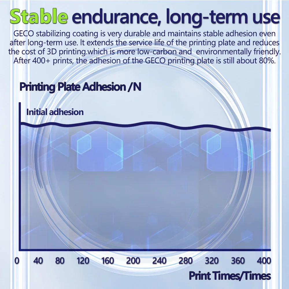 It has excellent adhesion without heating the platform,The model can be firmly attached to the GECO surface,Even beginners can print easily.Long term printing can still maintain 100% perfect adhesion,say goodbye to glue and spray, make every printing process smooth and effortless.