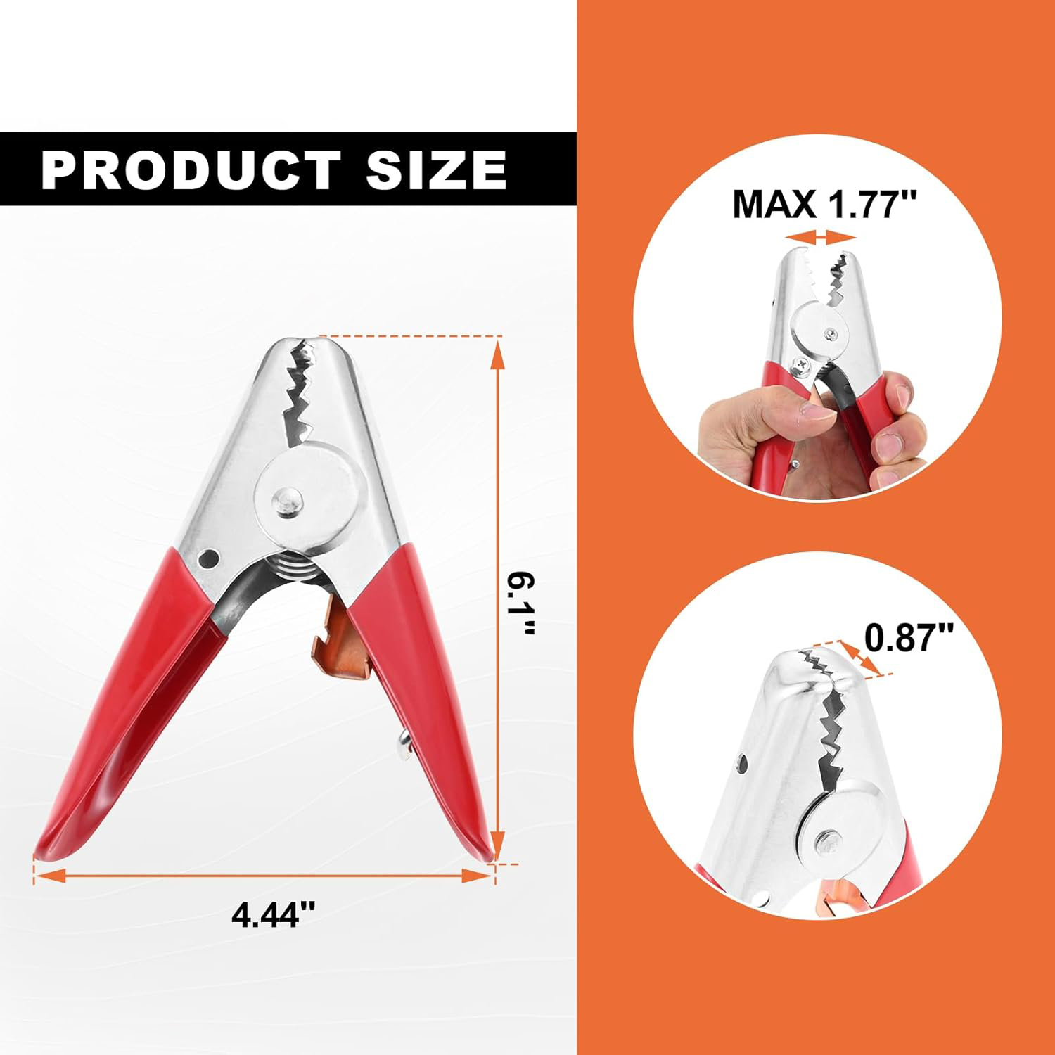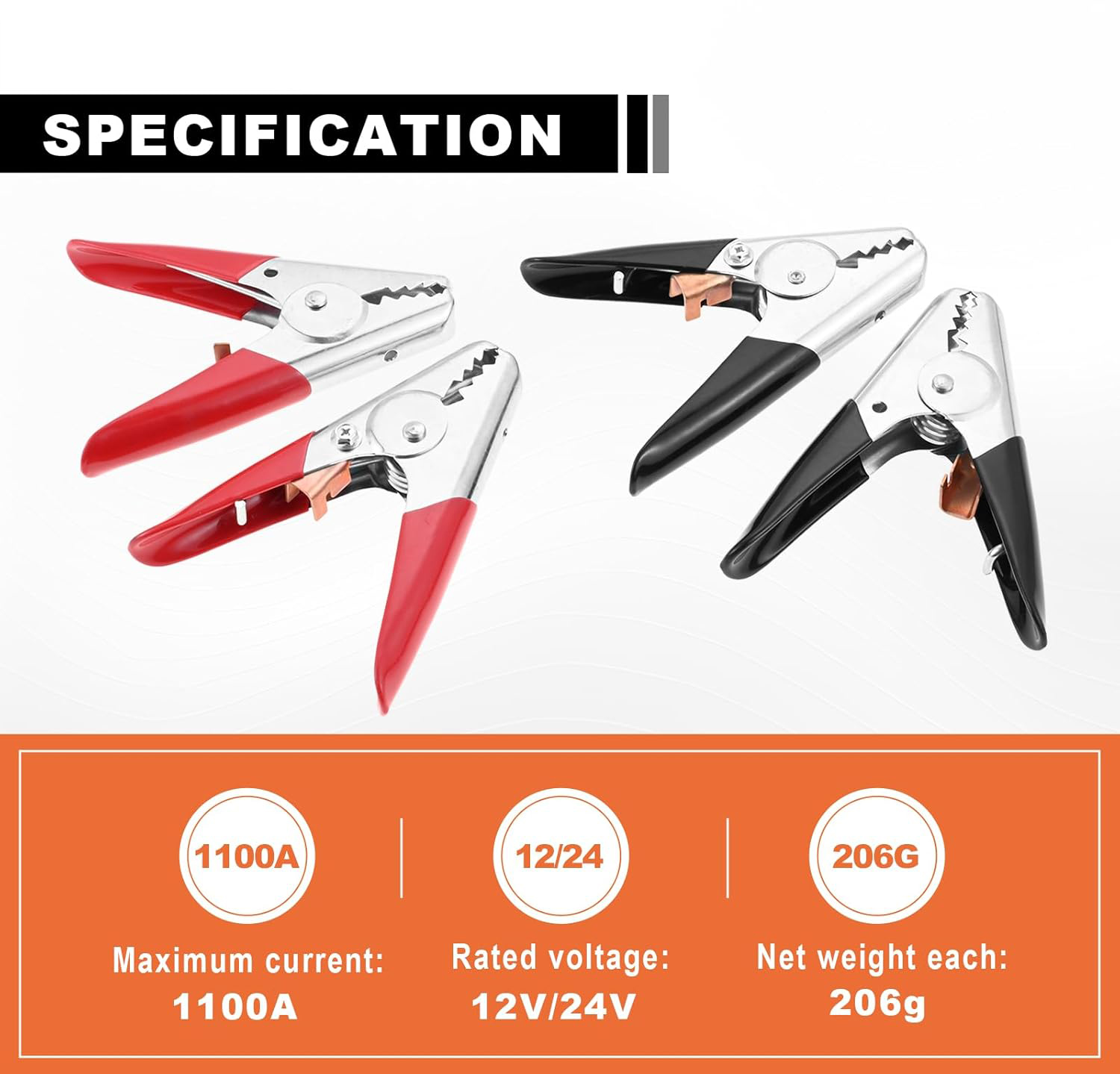 2.Replacement jumper cable clamps size is 6.1*4.44*1.06 inch. Individual jumper cable clamps heavy duty weight: 206 g, suitable for 0awg and smaller cables. Maximum current: 1100A. Recommended voltage: 12v, 24v. Maximum opening size: 1.77 inch.