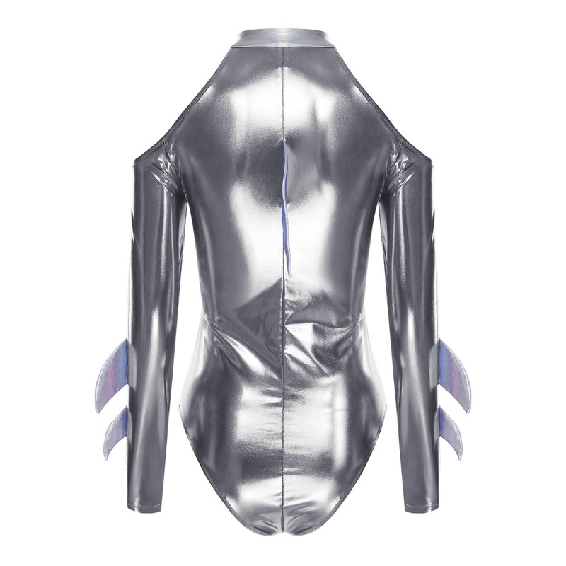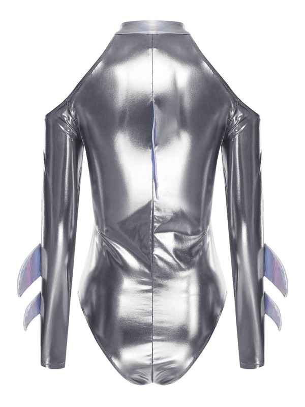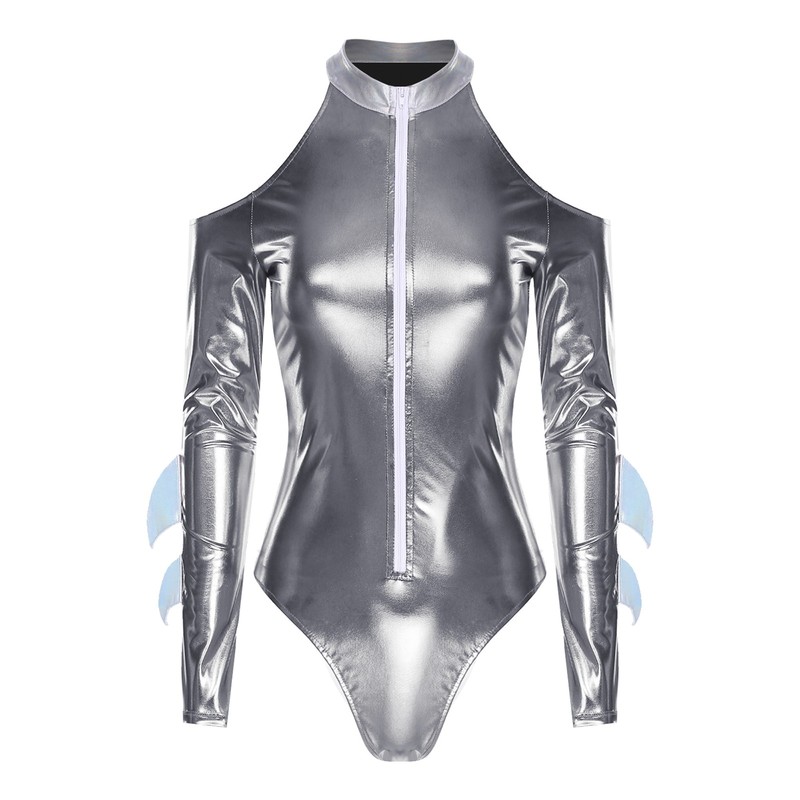 The metallic finish and fins details give the bodysuit a shiny and eye-catching appearance, making it suitable for creating a unique and fashionable image.