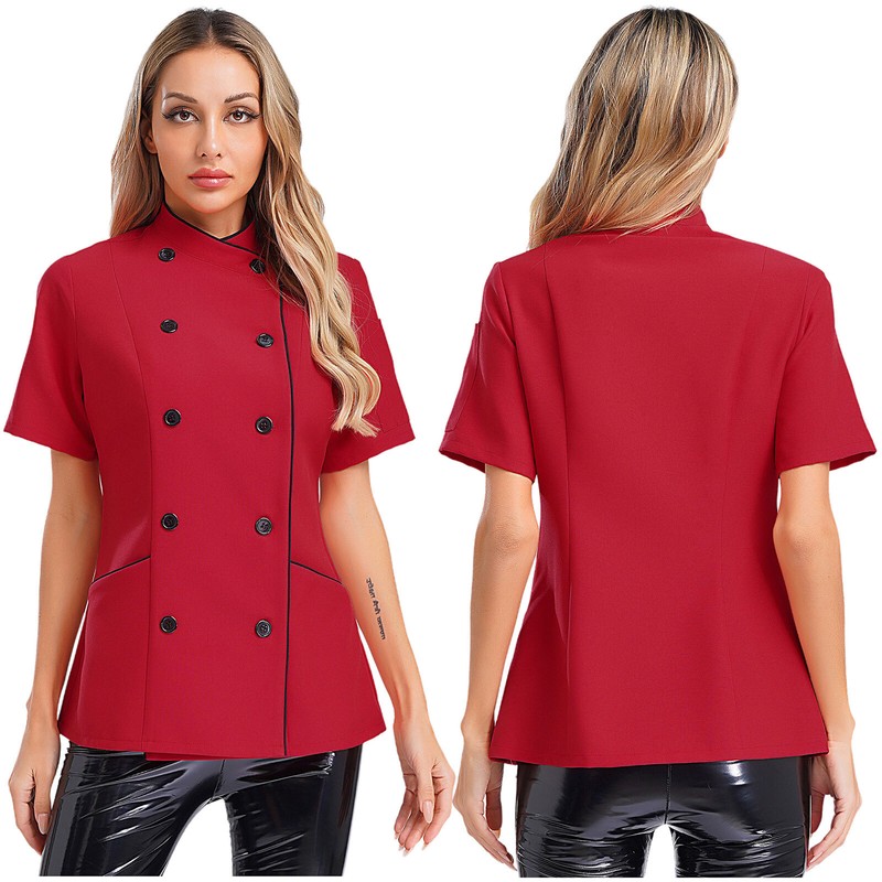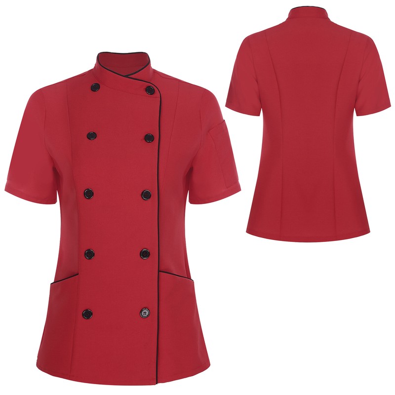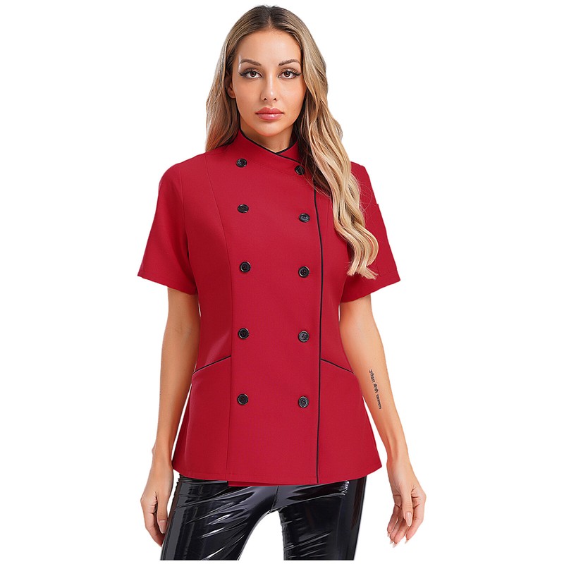 Women’s chef jacket, cross-over collar, double-breasted for easy wearing, contrast color trimming details, simple but stylish.