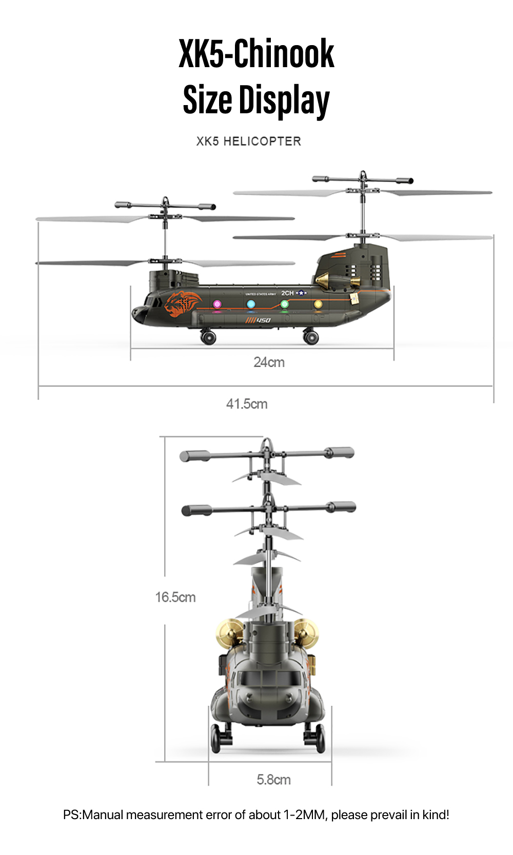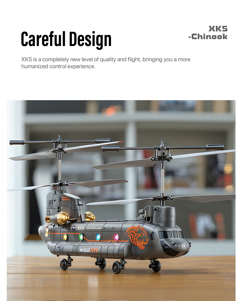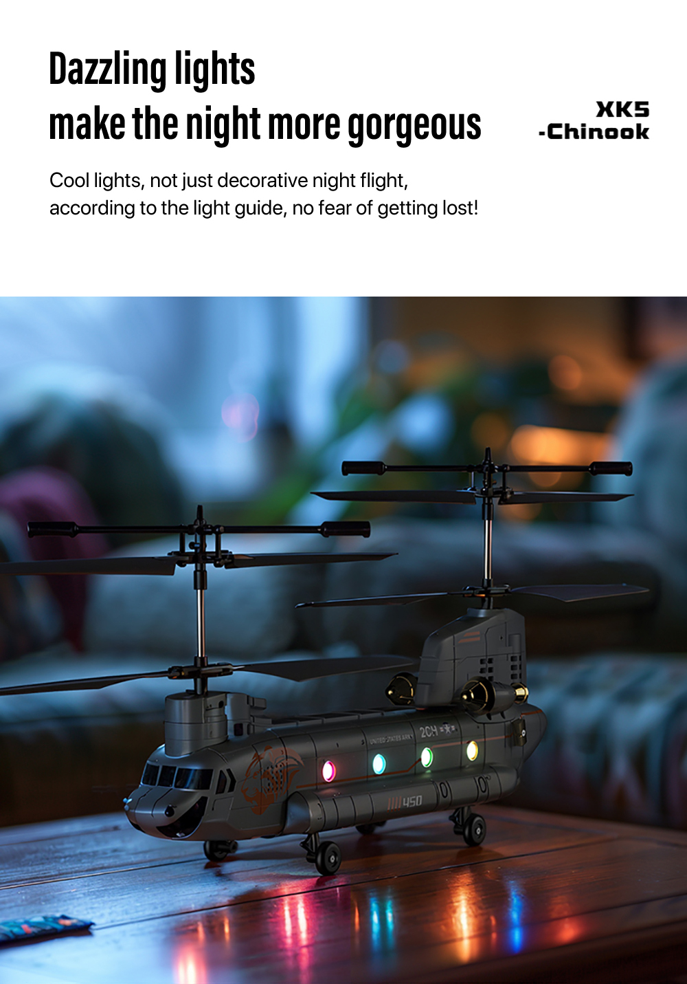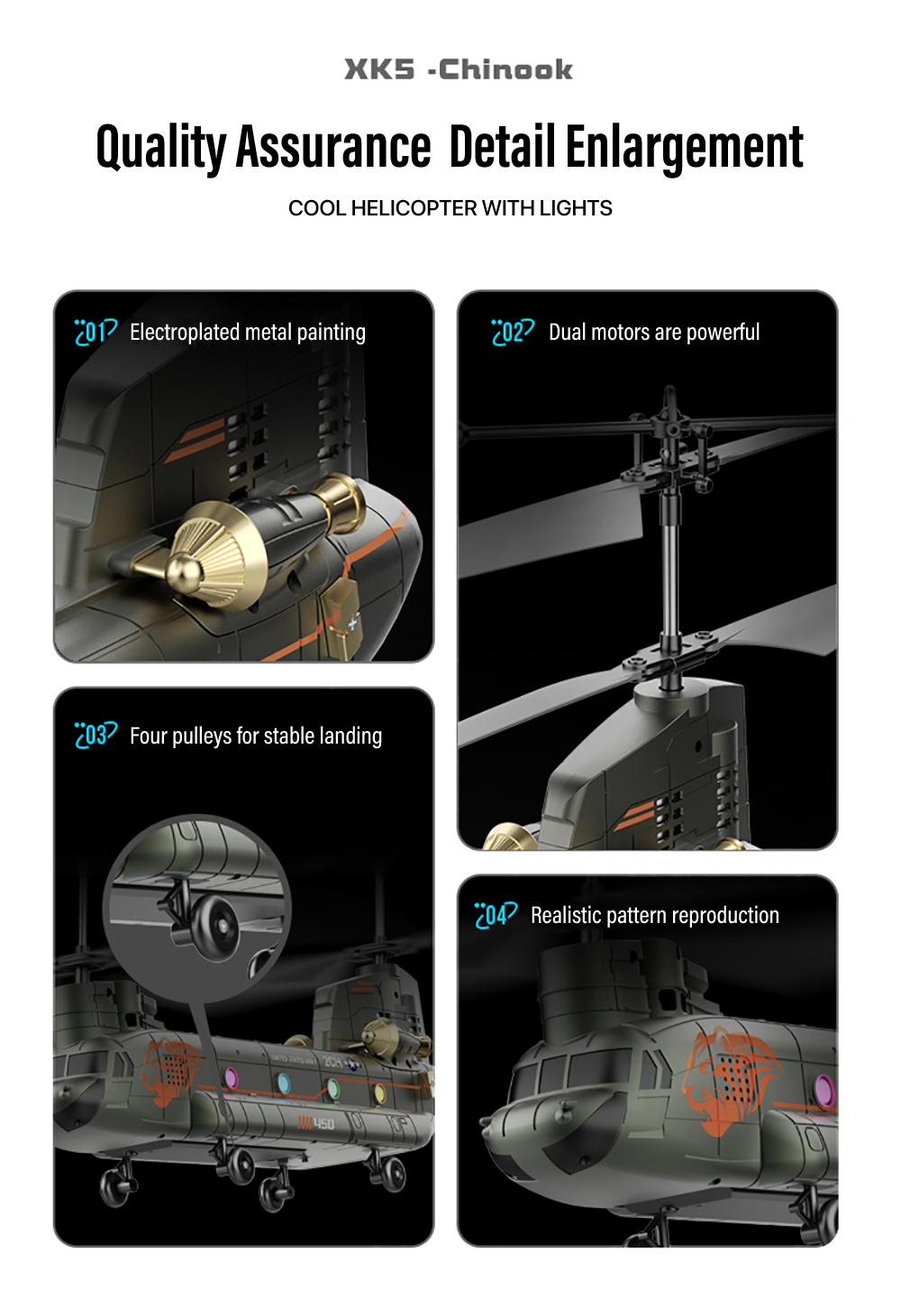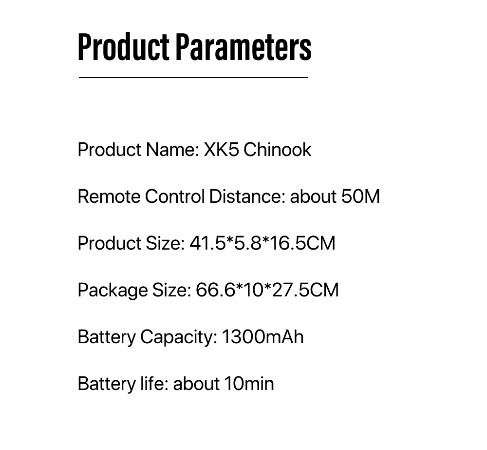 XK5 Chinook Remote Control HelicopterAdoption of 2.4GHZ system ,Cool lights design,Smart Height Setting ect functions,Four pulleys for stable landing, it has fast response, high precision, and precise return to the center, making it particularly suitable for beginners to fly.