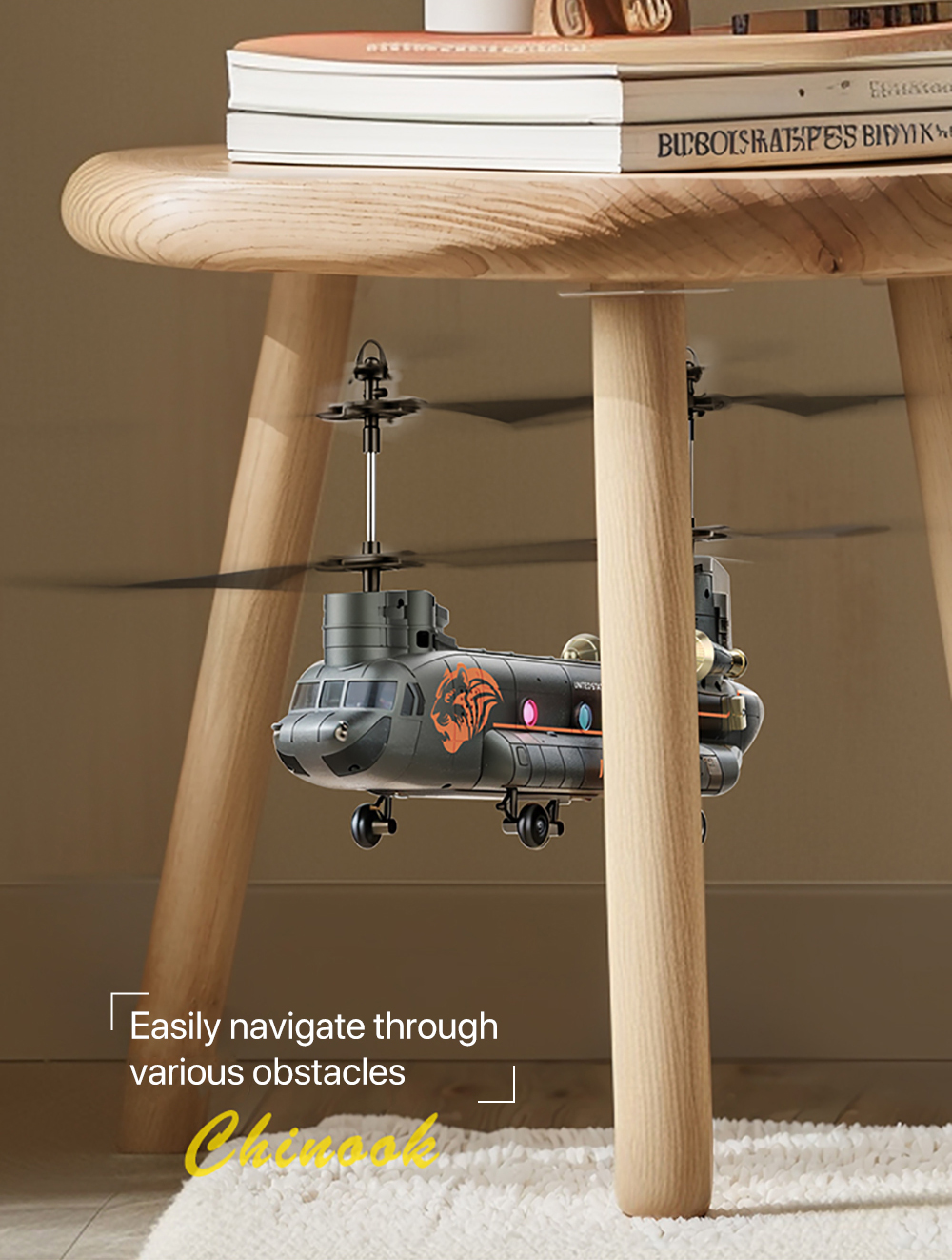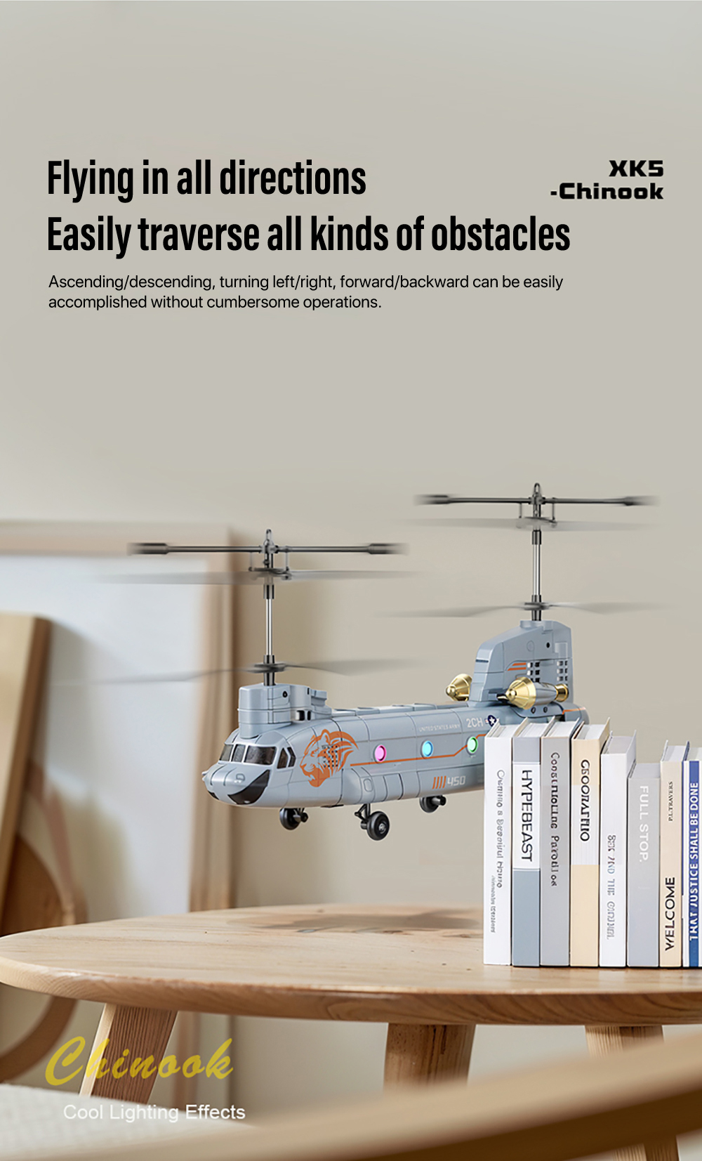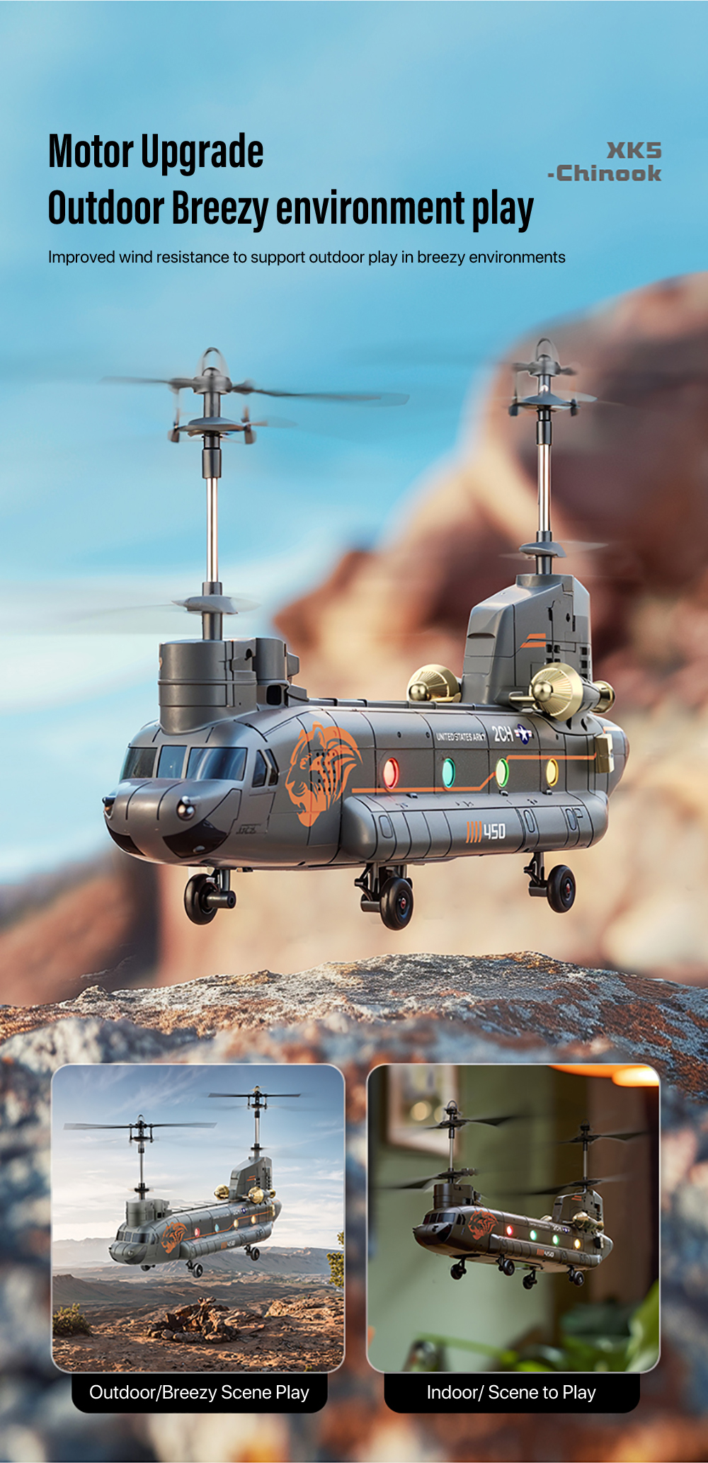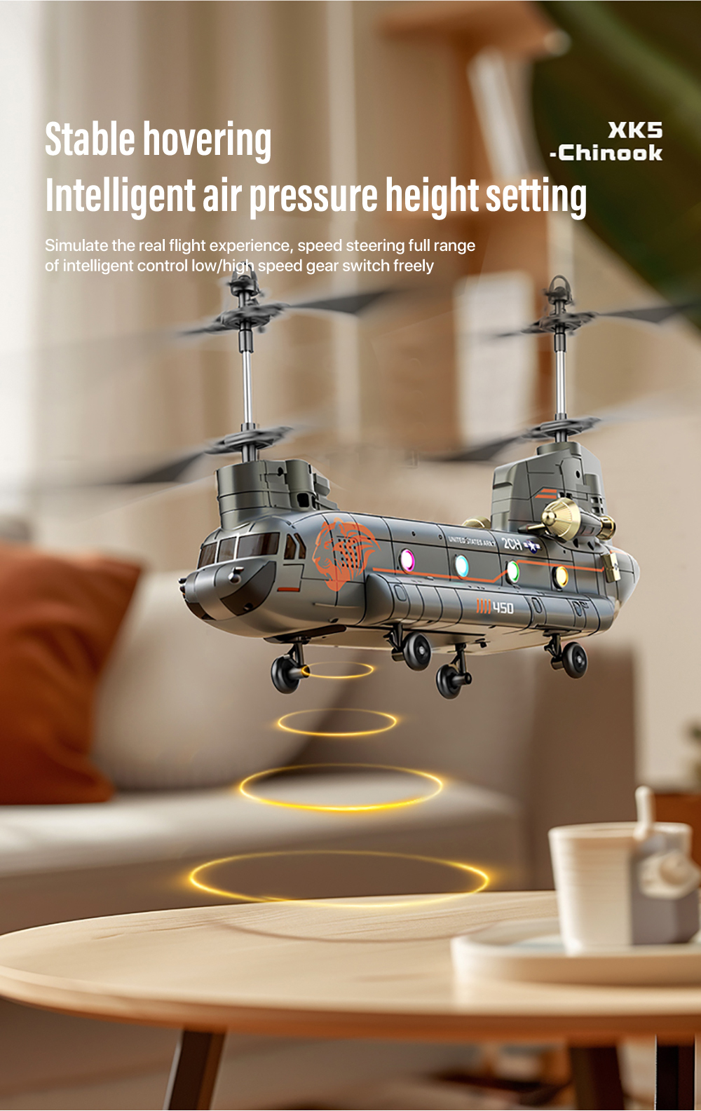 XK5 Chinook Remote Control HelicopterAdoption of 2.4GHZ system ,Cool lights design,Smart Height Setting ect functions,Four pulleys for stable landing, it has fast response, high precision, and precise return to the center, making it particularly suitable for beginners to fly.