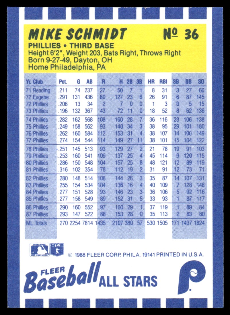 | 1988 Fleer Baseball All-Stars Mike Schmidt Philadelphia Phillies #36 |