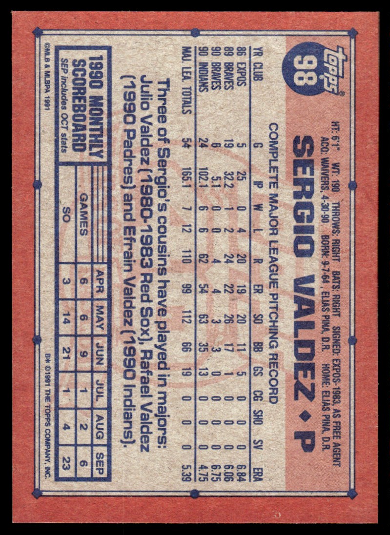 | 1991 Topps Sergio Valdez Cleveland Indians #98 |