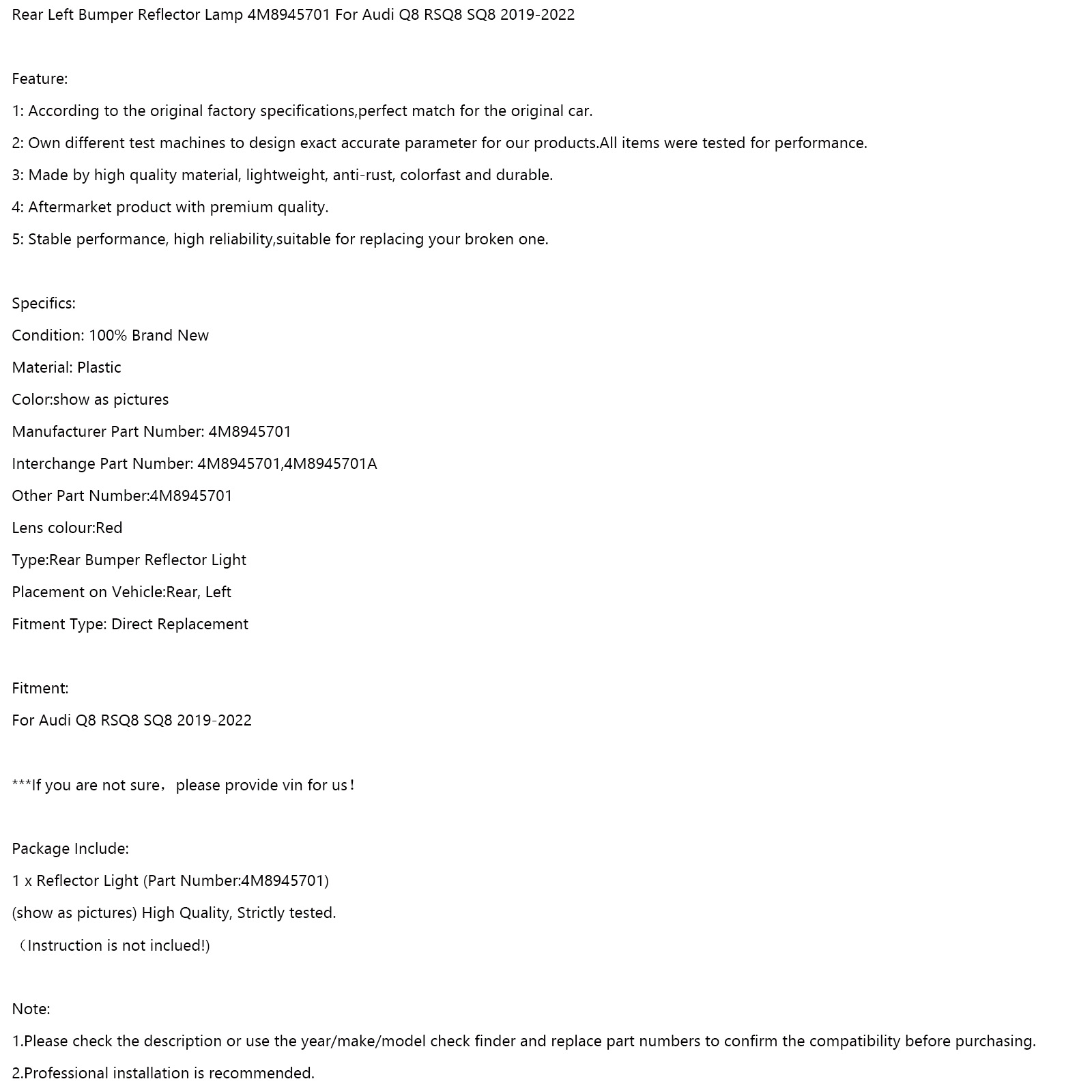 Rear Left Bumper Reflector Lamp 4M8945701 For Audi Q8 RSQ8 SQ8 2019-2022